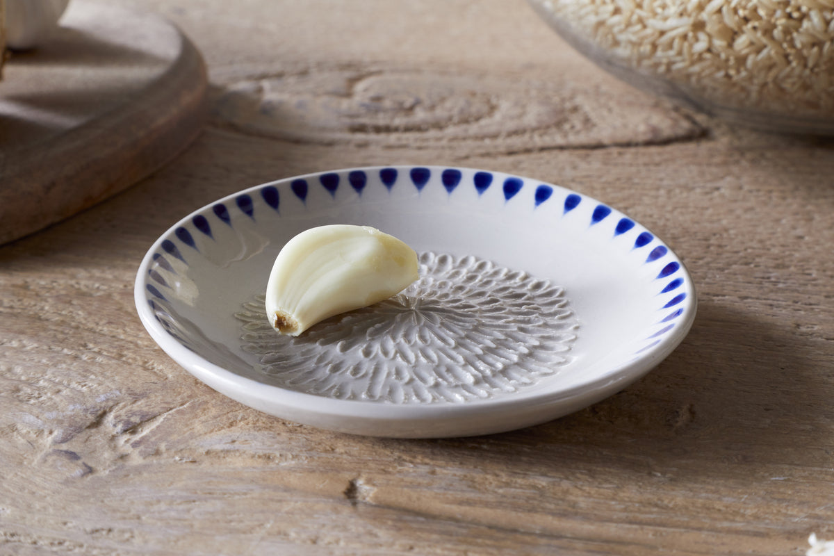 A wooden table features nkukus Indigo Drop Garlic Grater in Cream & Indigo with a clove of garlic, surrounded by garlic bulbs, rosemary sprig, a wooden board, and a glass jar of brown rice.The nkuku Indigo Drop Garlic Grater - Cream & Indigo, a small white ceramic dish with a textured center and hand-painted indigo pattern, rests on a wooden table beside garlic, rice in a glass jar, a cutting board, and rosemary.The nkuku Indigo Drop Garlic Grater - Cream & Indigo, with its hand-painted indigo design, rests on a wooden table among garlic bulbs, a cutting board, and a glass jar of rice.The nkuku Indigo Drop Garlic Grater in cream and indigo, featuring a textured center and hand-painted design, sits on a small white plate—perfect for grating garlic and adding style to your kitchen.The nkuku Indigo Drop Garlic Grater in cream and indigo features an intricate raised looped center pattern and a border of blue teardrop shapes, with a subtle hand-painted design from the Indigo Drop collection.The nkuku Indigo Drop Garlic Grater in Cream & Indigo is a shallow, round beige ceramic plate with a textured center and hand-painted dark blue triangle accents around the rim, perfect for grating garlic.