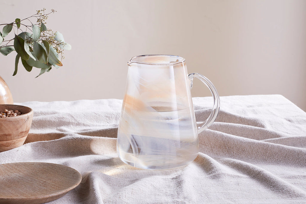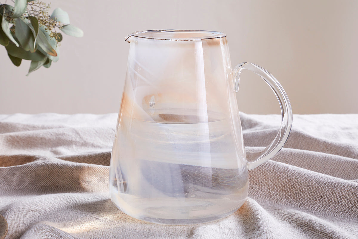Our new Shirali jug has a contemporary, sleek design aesthetic, generous proportions and an ethereal apricot glow that lends itself to becoming the stylish focal point of any table setting. Perfect to add interest to neutrals but equally striking in contrast with a darker scheme. The smooth-formed glass gives it a beautiful sheen that contrasts with the irregular colour patterning that gives a sense of texture. Coordinates with the Shirali wine glasses and tumblers.