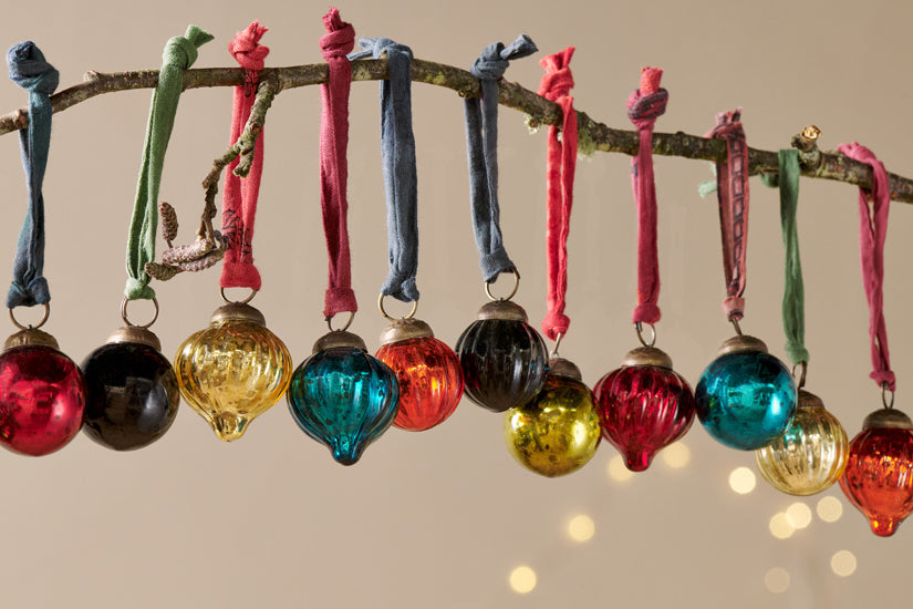 Our set of 12 Dew Drop Baubles provide a waterfall of rich antique colour to any festive decor. The gorgeous jewel-like shades of these exquisitely shaped baubles make them a wonderful finishing touch to a sumptuously decked-out tree or bare branch display. Finished with an antique-style clasp and elegant sari tie.