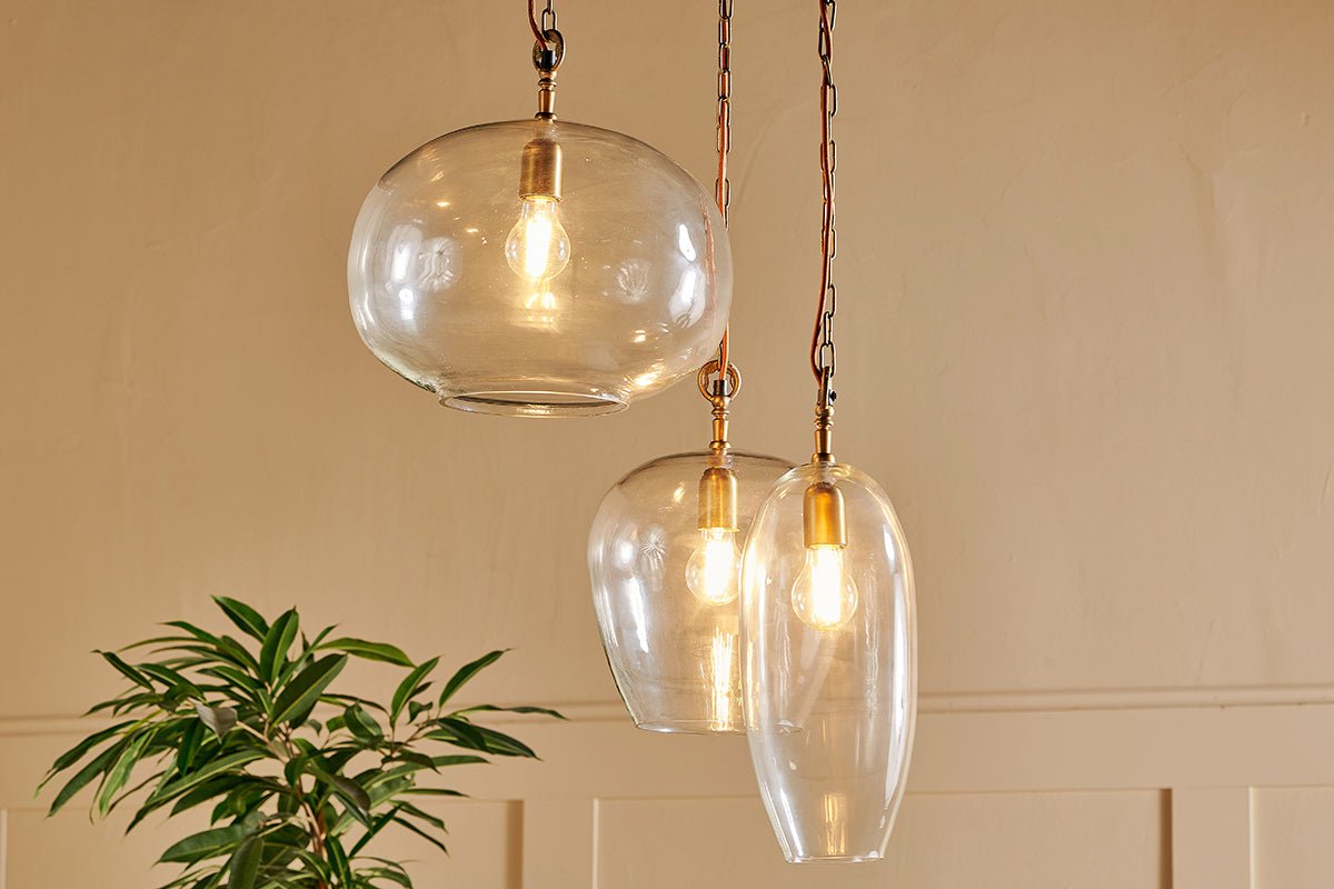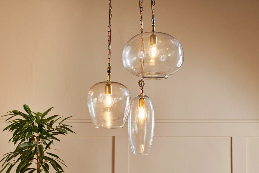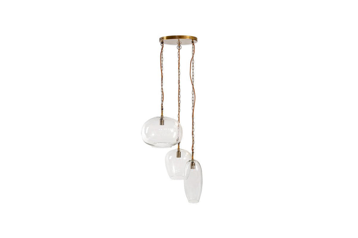 The Otoro statement pendant light is a truly standout piece. The different organic shapes of the Otoro recycled glass shades work beautifully together. The generous proportions of each light combine to create an exceptional pendant feature light that will elevate a space. This is a large statement piece that is well suited to a high ceilinged room or stair well. The Otoro glass lights are made from recycled glass. The simple black coloured fabric cable sits neatly in a brass ceiling rose. Each light is supported with a simple brass chain