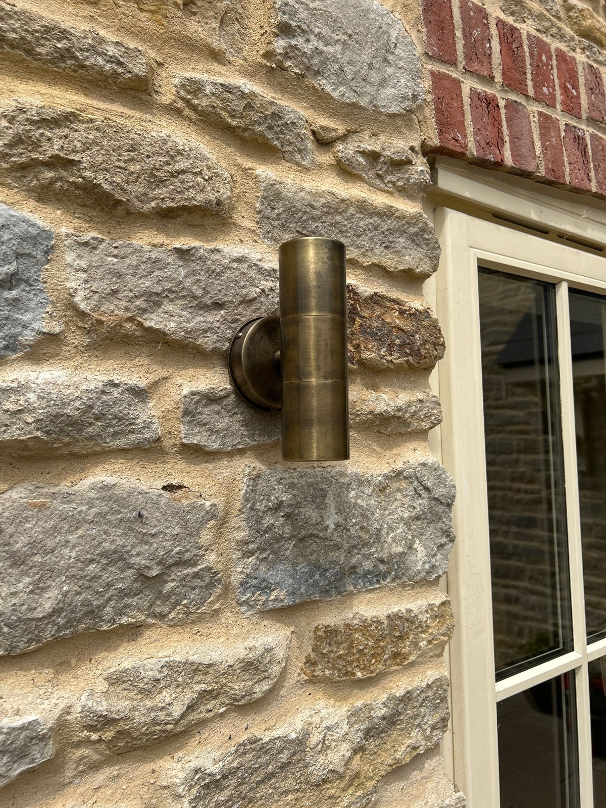 A stylish and timeless shape with industrial features, this lamp looks elegant on either side of a doorway or in a garden terrace area for ambient lighting. The diffuse light that is delivered from both above and below the cylindrical light creates a gentle glow all round for an atmospheric setting. Made from solid brass in a classic shape that blends elegance with an industrial aesthetic. The hardwearing materials are perfect for its intended use outdoors and allow it to withstand all weathers. The brass will oxidise over time, allowing it to age gracefully with its surroundings.