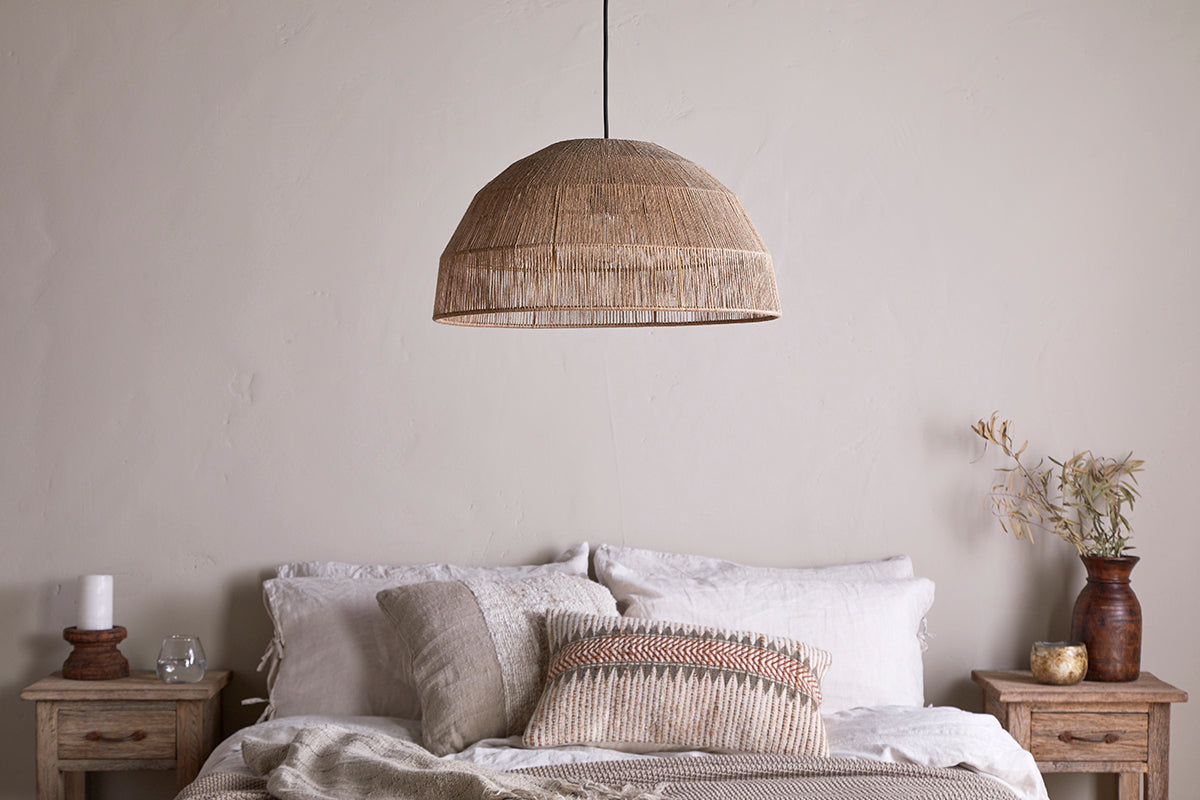 Our Tivi Jute Lampshade highlights the beauty of jute, a core material for nkuku. Its natural fibres offer a raw, rustic look, while the dome shape provides a soft aesthetic. Designed to let light stream through the woven fabric, this lampshade effectively disperses illumination, creating a warm glow and elegant ambience.