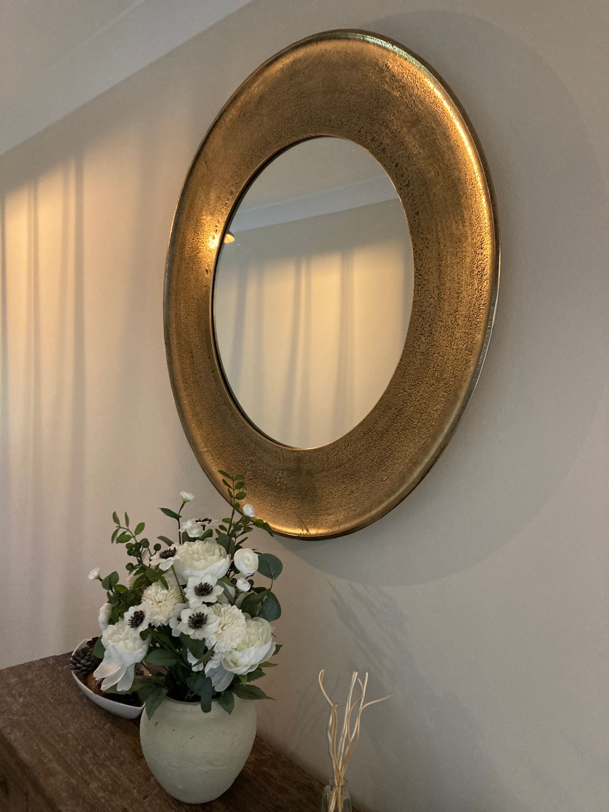 Stylish and beautifully crafted our Yakira mirror makes a striking focal point. The circular design has a deep textured border that celebrates the artisan process. The antique brass finish gives it an attractive antique look.