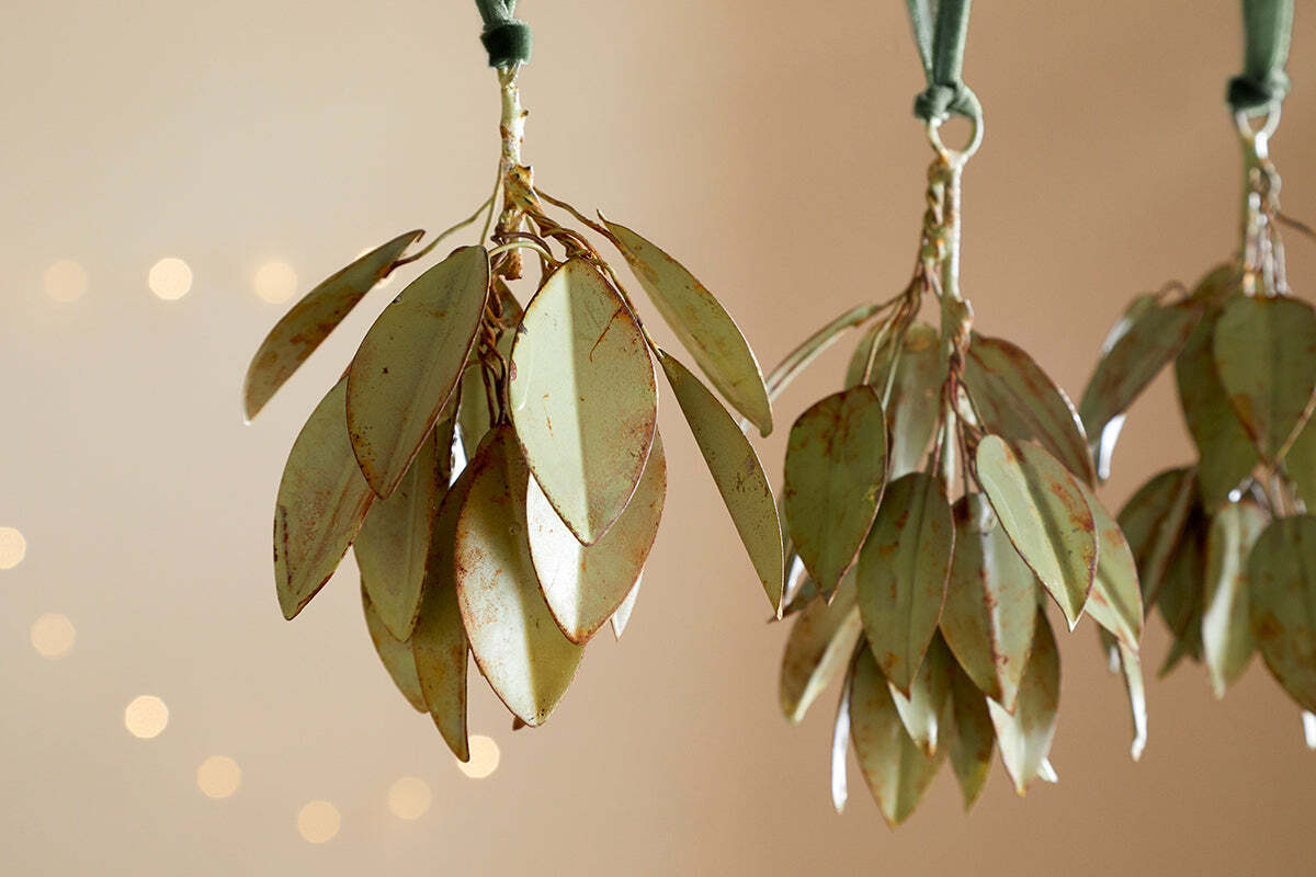 The Geeti baubles capture the organic beauty of foliage with a leaf-like form and an aged green finish. The cool metallic tones add a fresh, nature-inspired feel to festive settings, while a rich green velvet tie completes the look with a soft, elegant touch. Perfect for adding depth and earthy detail to your decorations.