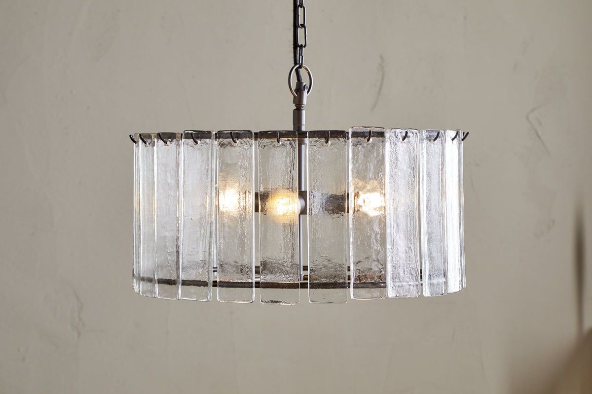 Our Nauka chandelier is an elegant and striking statement piece. The recycled glass delicately diffuses light, adding a soft textured ambience to any room. Complete with brass details, this chandelier is a stunning finishing touch for a hallway, dining area, or even a lofty living room ceiling.