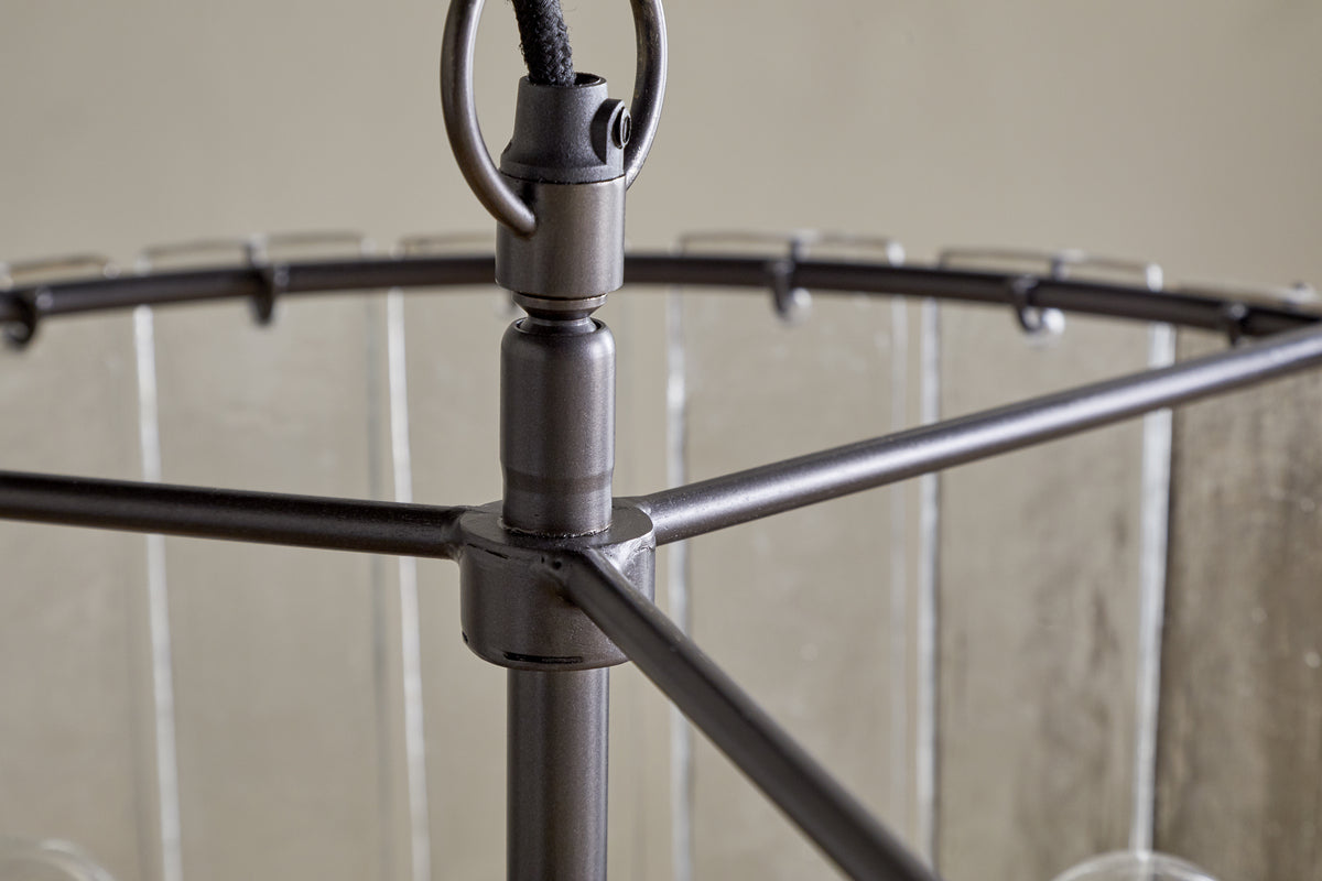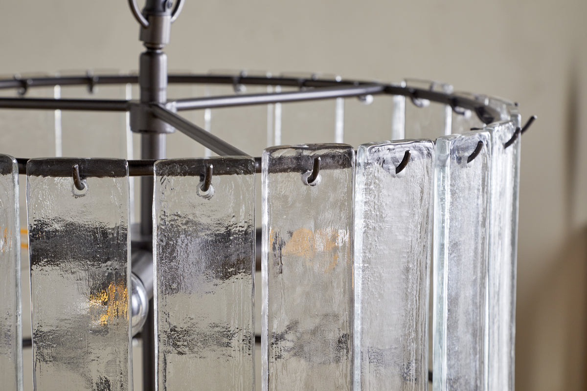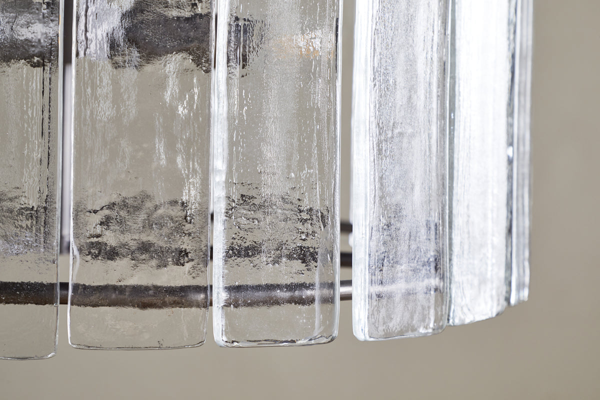 We use recycled glass to make these collections. Firstly, the waste glass is collected and washed to remove any impurities; it is then crushed and melted down before being hand blown into simple moulds to create beautiful new products. Crafted with expertise and care, each glass pane in this chandelier is individually pressed, making each piece entirely unique.