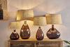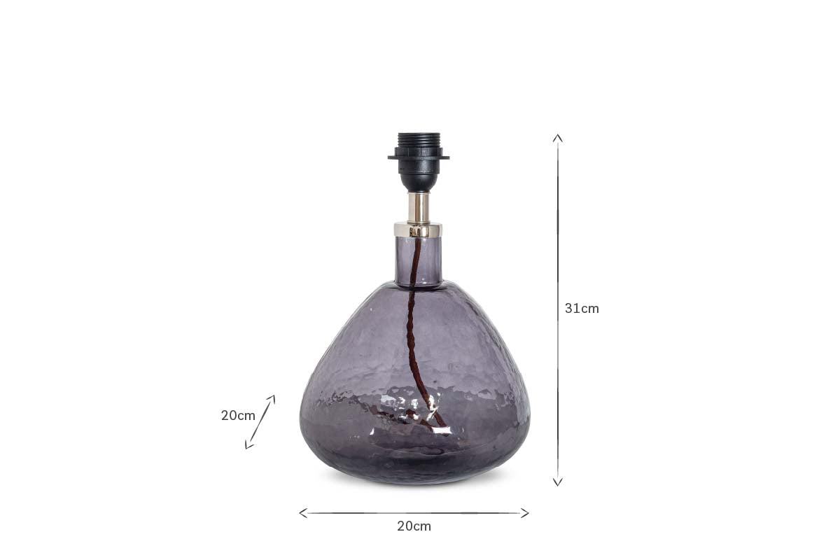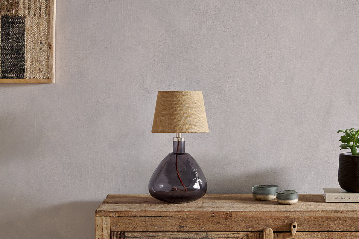 The elegantly curved form of our organic-shaped Baba table lamp is skilfully crafted from recycled glass with a soft, textured hammered finish. This is a statement piece that adds natural, welcoming warmth to your home, whether placed on a sideboard, an entrance hall table, or by your bedside for a unique ambiance. The smoky hue of this lamp base enhances the rest of your furnishings and looks beautiful when styled with a Dia jute lampshade to complete the look.