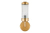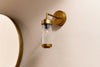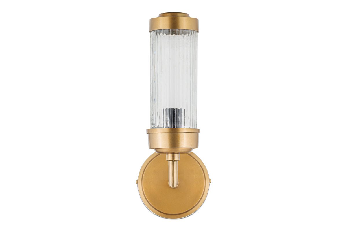 The Akurdi cylindrical glass wall light blends contemporary design with timeless materials of aged brass and clear glass. The ribbed design detail suits the pill shape and adds an attractive design detail. The Akurdi wall light offers a soft glow, and it is IP44 rated for suitability in a bathroom, it's single-arm design is elegant and easy to style in both contemporary and more industrial-inspired interiors.