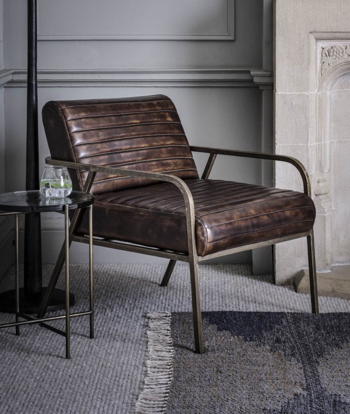 Handmade from buffalo leather that has been aged for a beautiful patina and depth, this timeless design has a heavy cast iron frame with a brass finish that perfectly offsets the dark leather, working well as a reading chair.