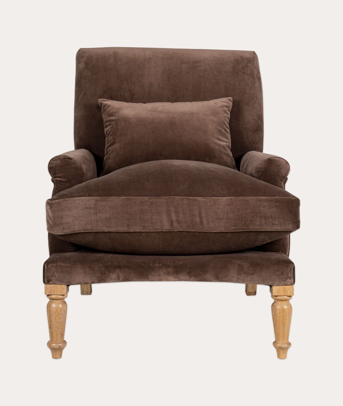 The natural coffee tones of the luxurious velvet Nalla armchair perfectly suits a warmer autumn palette. This is a classic, traditionally-shaped design, perfect for a reading nook or quiet corner and comes with a lumber cushion for extra comfort.