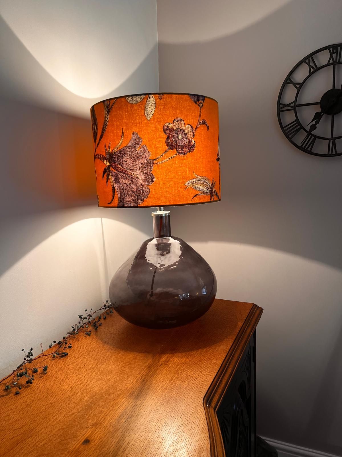 This large curvaceous, organic-shaped Baba glass lamp base is skilfully crafted from recycled glass with a soft, textured hammered finish. The burnt amber hue of the glass gives this table lamp a sophisticated look when styled with a Dia jute lampshade to complete the look.
