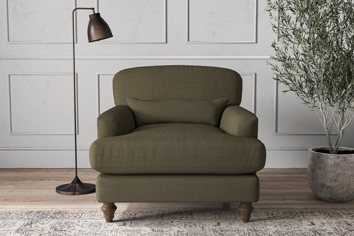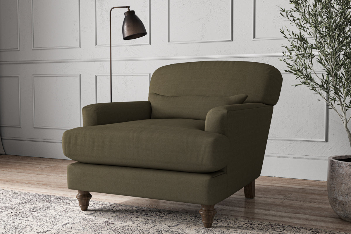 Our Deni armchair is generously proportioned with deep, sumptuous seat cushions for luxurious comfort. Handcrafted from a solid hardwood frame with high-grade steel serpentine springs and foam and fibre wrap filling, this timeless collection celebrates the best of British quality and design. Fine details include in-built back cushions, hand-turned hardwood feet and a separate lumbar cushion for added comfort.