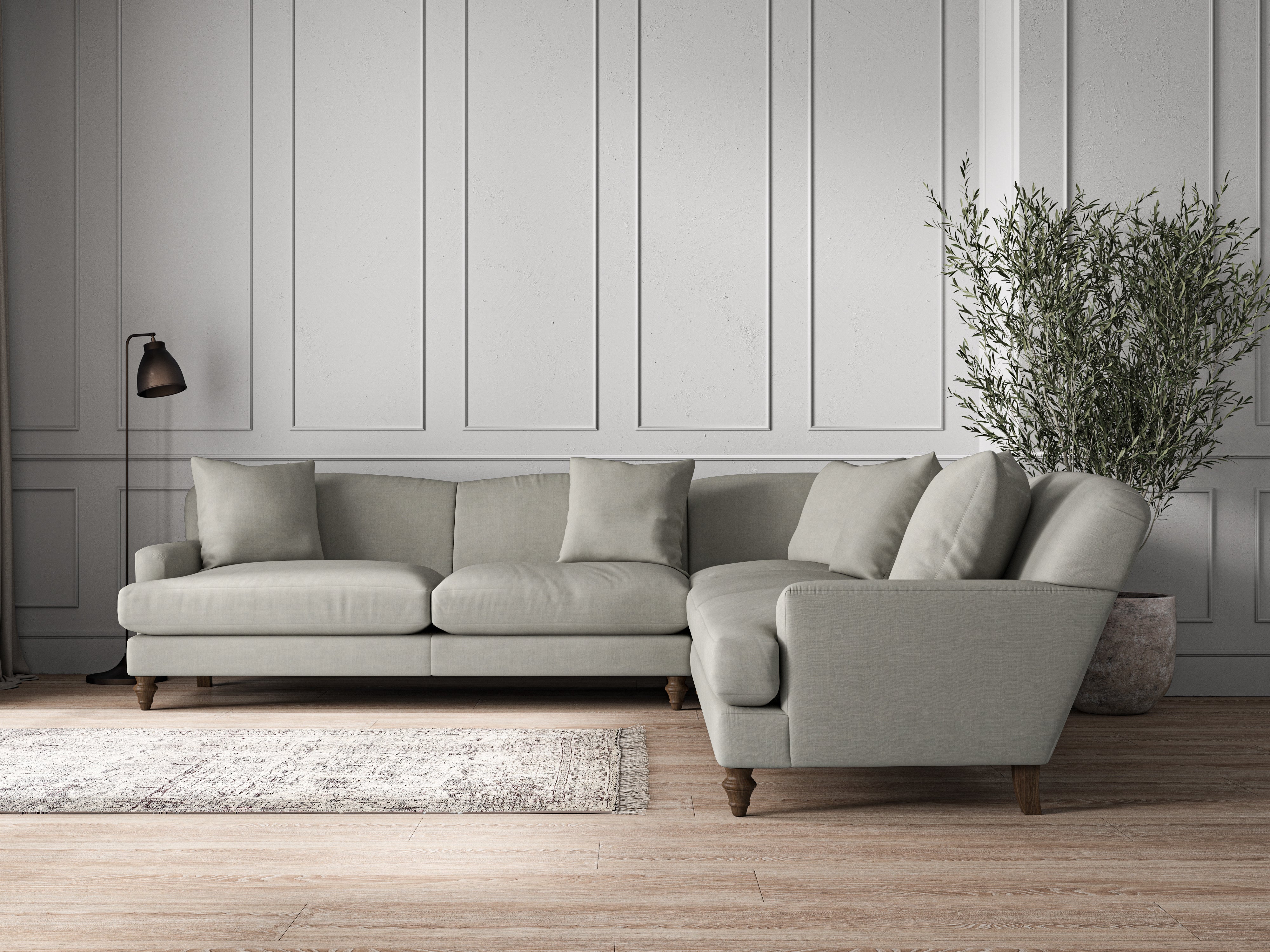 Our Deni grand corner sofa is generously proportioned with deep, sumptuous seat cushions for luxurious comfort. Handcrafted from a solid hardwood frame with high-grade steel serpentine springs and foam and fibre wrap filling, this timeless collection celebrates the best of British quality and design. Fine details include in-built back cushions, hand-turned hardwood feet and a set of five scatter cushions for added comfort.