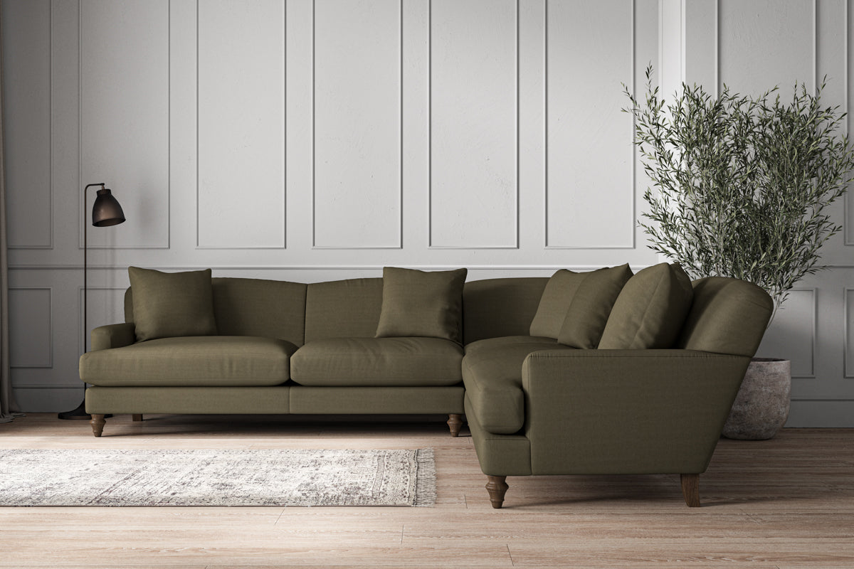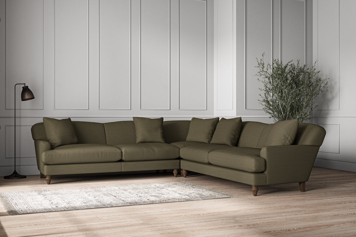Our Deni grand corner sofa is generously proportioned with deep, sumptuous seat cushions for luxurious comfort. Handcrafted from a solid hardwood frame with high-grade steel serpentine springs and foam and fibre wrap filling, this timeless collection celebrates the best of British quality and design. Fine details include in-built back cushions, hand-turned hardwood feet and a set of five scatter cushions for added comfort.