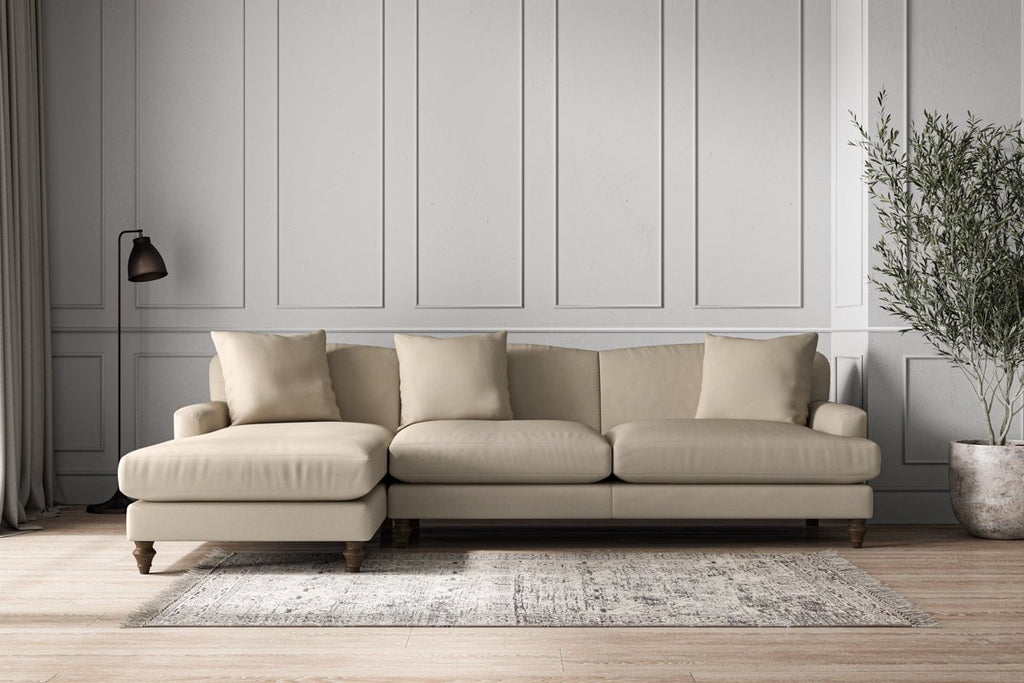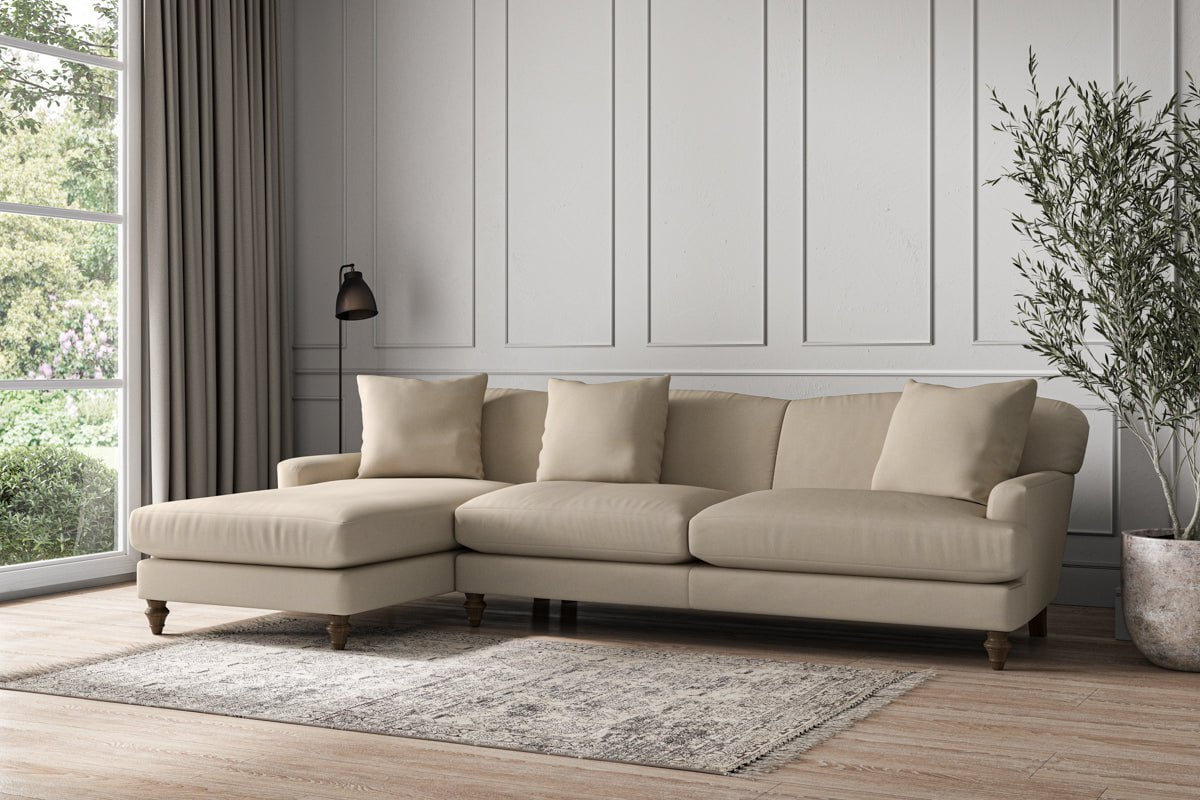 Our Deni grand left hand chaise sofa is generously proportioned with deep, sumptuous seat cushions for luxurious comfort. Handcrafted from a solid hardwood frame with high-grade steel serpentine springs and foam and fibre wrap filling, this timeless collection celebrates the best of British quality and design. Fine details include in-built back cushions, hand-turned hardwood feet and a set of three scatter cushions for added comfort.