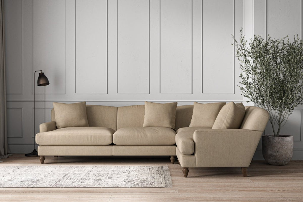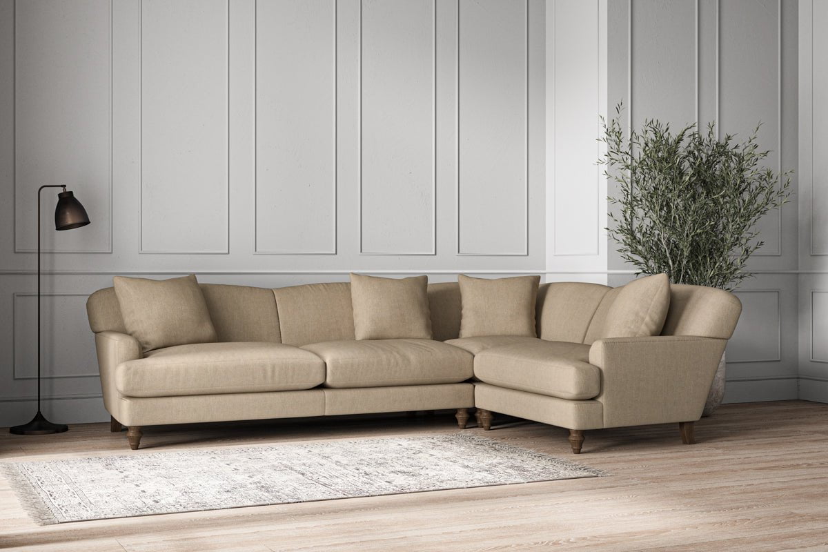 Our Deni grand right hand corner sofa is generously proportioned with deep, sumptuous seat cushions for luxurious comfort. Handcrafted from a solid hardwood frame with high-grade steel serpentine springs and foam and fibre wrap filling, this timeless collection celebrates the best of British quality and design. Fine details include in-built back cushions, hand-turned hardwood feet and a set of four scatter cushions for added comfort.