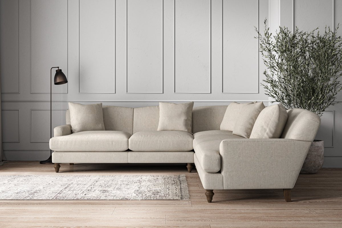 Our Deni large corner sofa is generously proportioned with deep, sumptuous seat cushions for luxurious comfort. Handcrafted from a solid hardwood frame with high-grade steel serpentine springs and foam and fibre wrap filling, this timeless collection celebrates the best of British quality and design. Fine details include in-built back cushions, hand-turned hardwood feet and a set of five scatter cushions for added comfort.