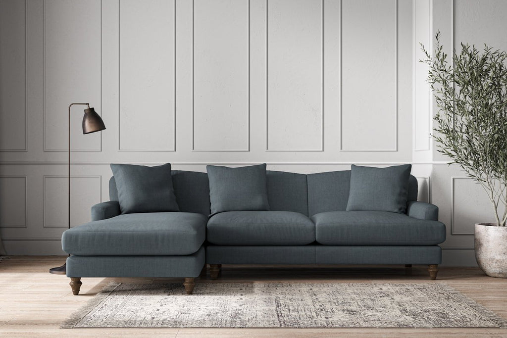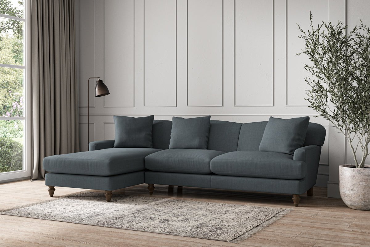 Our Deni large left hand chaise sofa is generously proportioned with deep, sumptuous seat cushions for luxurious comfort. Handcrafted from a solid hardwood frame with high-grade steel serpentine springs and foam and fibre wrap filling, this timeless collection celebrates the best of British quality and design. Fine details include in-built back cushions, hand-turned hardwood feet and a set of three scatter cushions for added comfort.