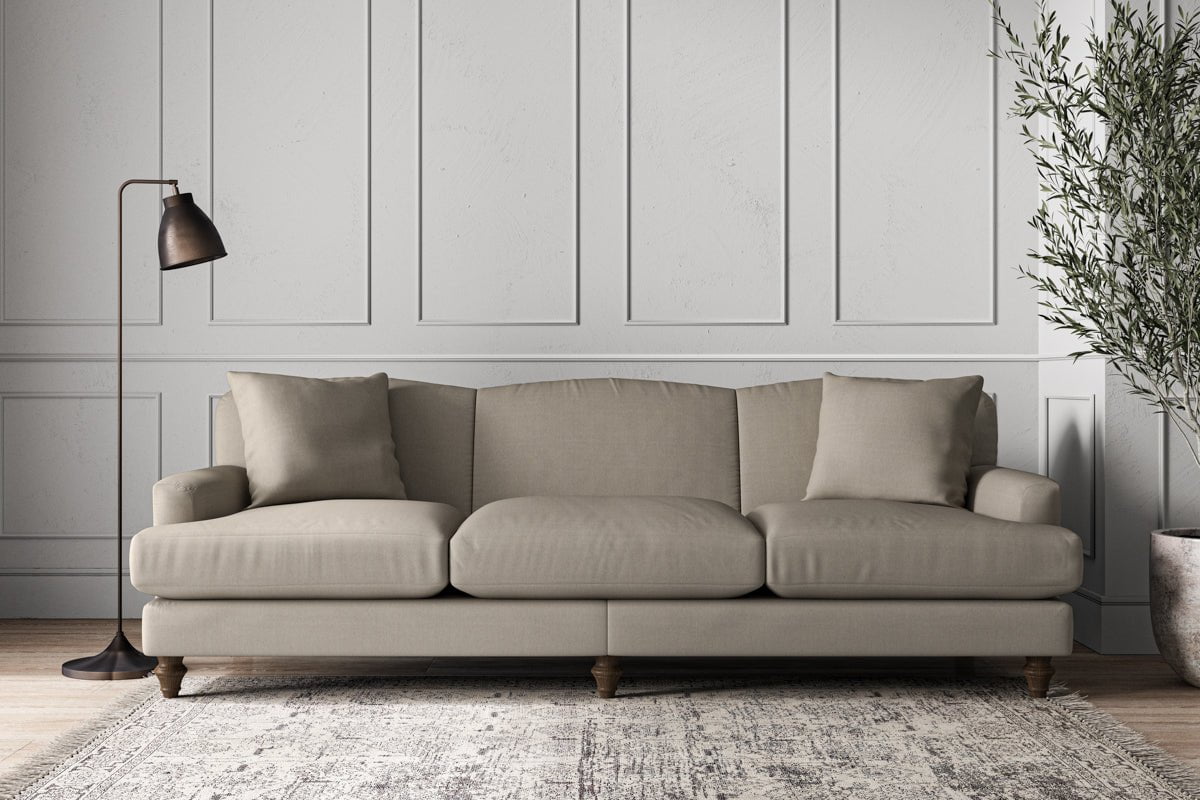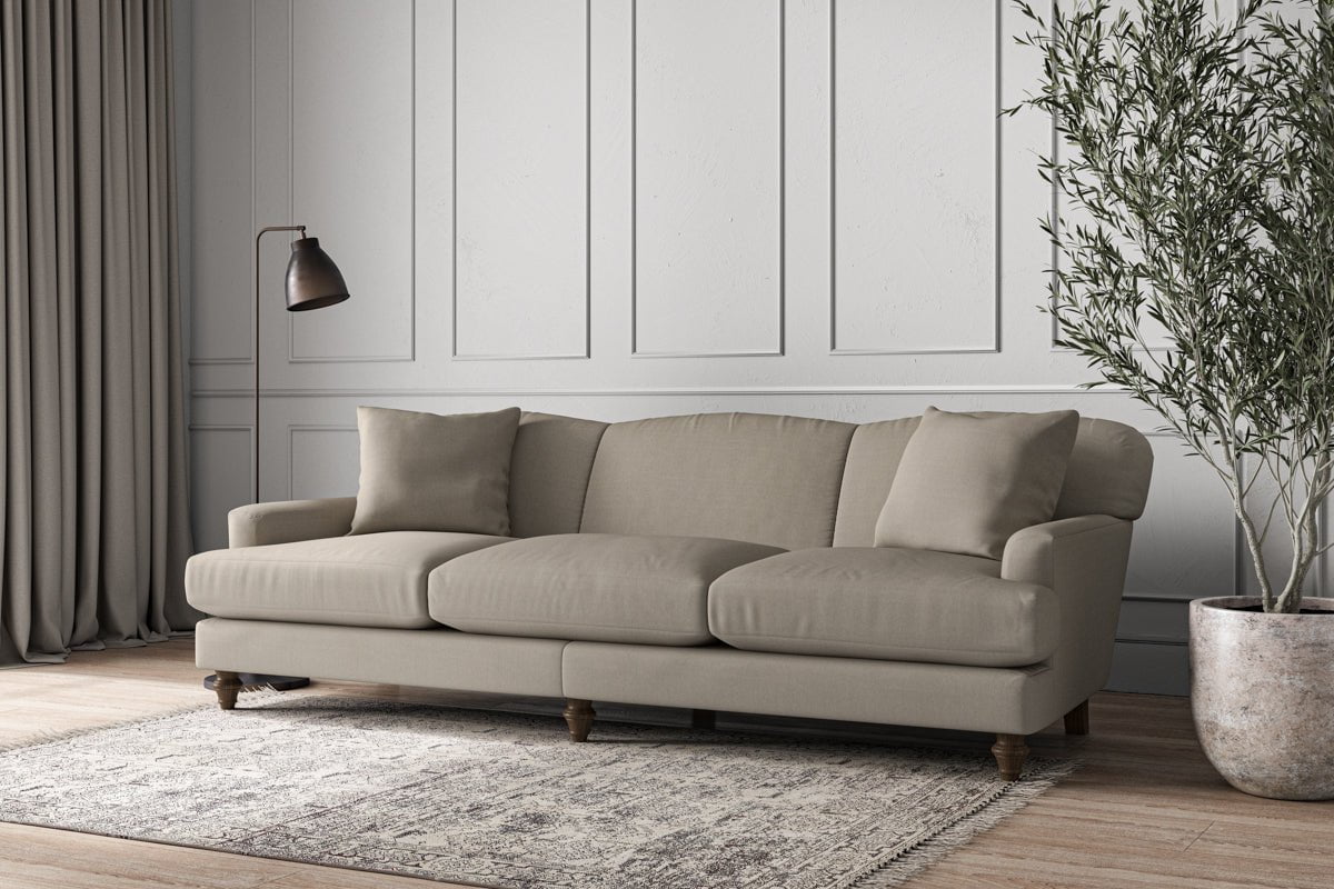 Our Deni super grand sofa is generously proportioned with deep, sumptuous seat cushions for luxurious comfort. Handcrafted from a solid hardwood frame with high-grade steel serpentine springs and foam and fibre wrap filling, this timeless collection celebrates the best of British quality and design. Fine details include in-built back cushions, hand-turned hardwood feet and a set of two scatter cushions for added comfort.