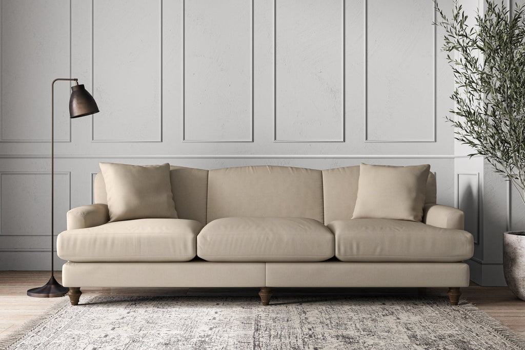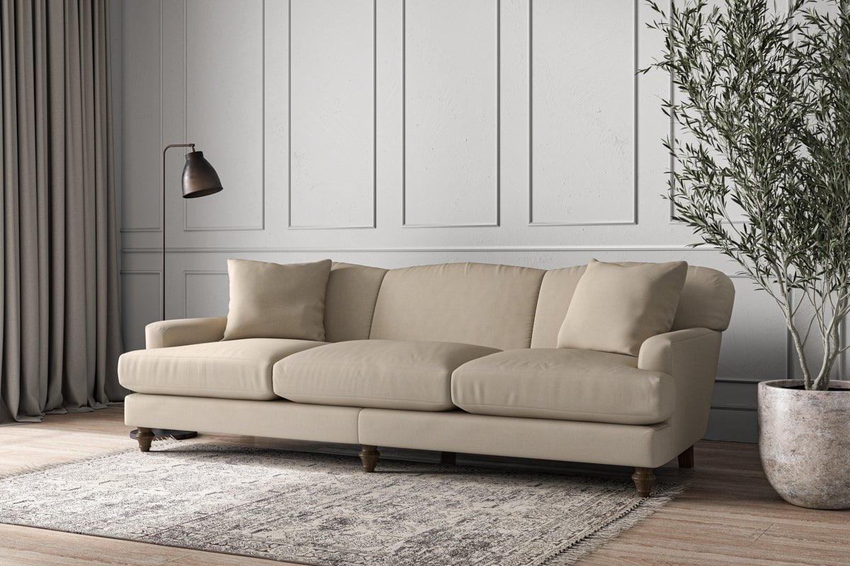 Our Deni super grand sofa is generously proportioned with deep, sumptuous seat cushions for luxurious comfort. Handcrafted from a solid hardwood frame with high-grade steel serpentine springs and foam and fibre wrap filling, this timeless collection celebrates the best of British quality and design. Fine details include in-built back cushions, hand-turned hardwood feet and a set of two scatter cushions for added comfort.
