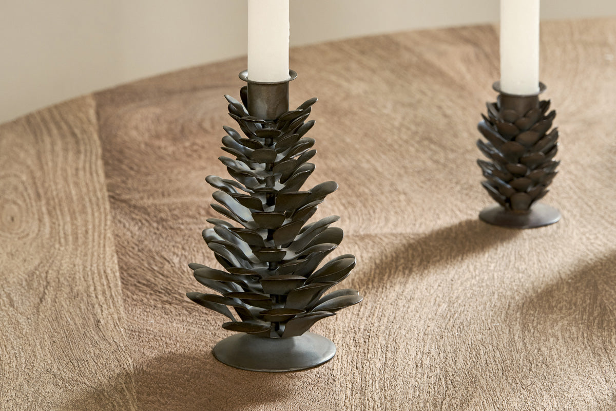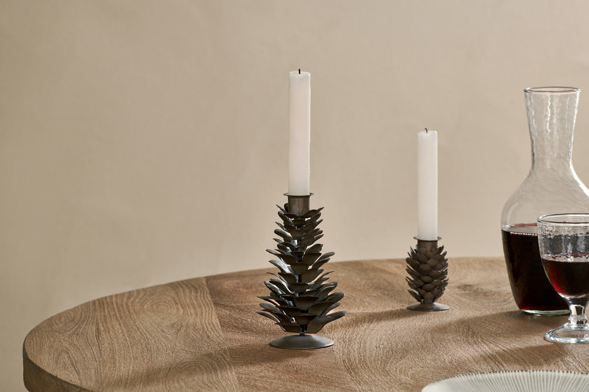 This charming candle holder promises to bring a playful feel to your seasonal dining table. In true nkuku style, the simple design in aged brass has a textured effect for added interest, chosen specifically to create a beautiful setting when paired with our ceramics. We've brought the evocative shape of winter woodland walks into your living space to spread comfort and joy throughout the home. Ideal on a sideboard, dining table or mantelpiece, styled alone or with our pair of smaller Elagalu holders for a beautifully natural and relaxed display. Style with our dinner candles.