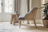 Our beautifully crafted Elbu chair is a timeless classic with a twist; the deconstructed back and sides reveal a natural mango wood frame and hemp panels for a pared-back aesthetic. Its elegant sizing makes it a subtle and elegant choice for a living space or bedroom. This new charcoal cotton and linen jacquard weave fabric is hand-upholstered for a timeless and striking addition to the Elbu collection.