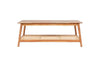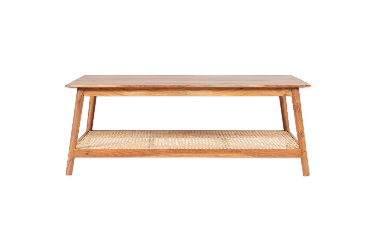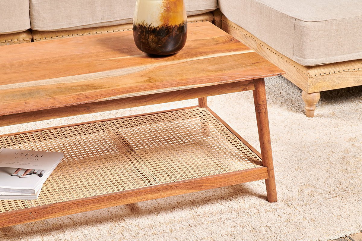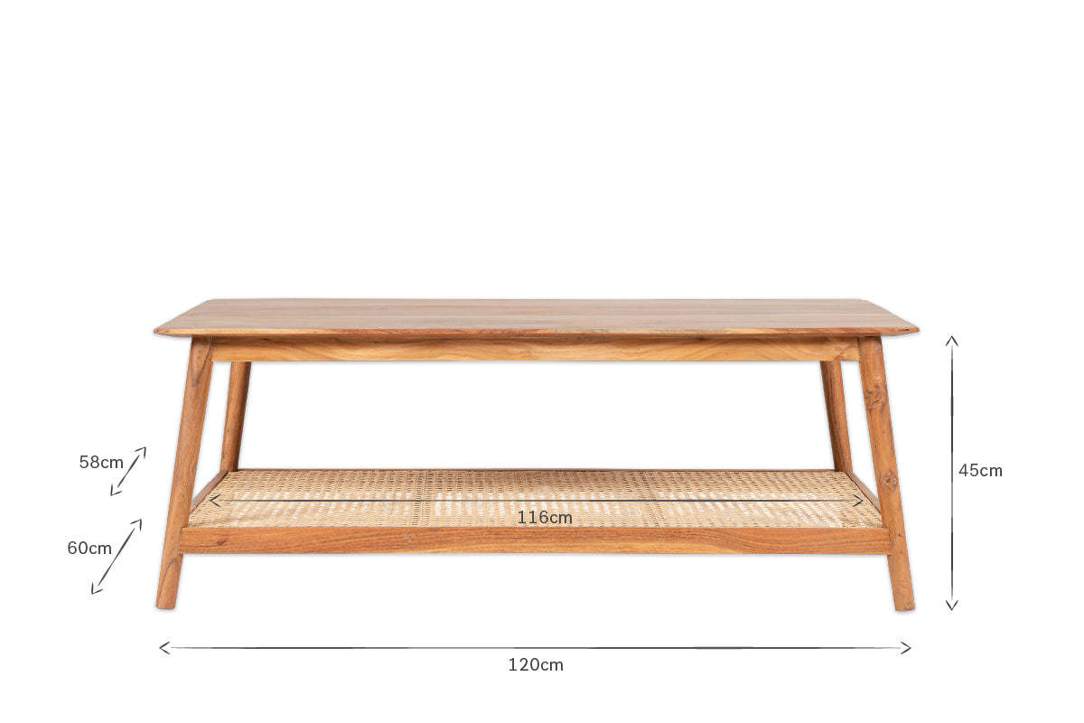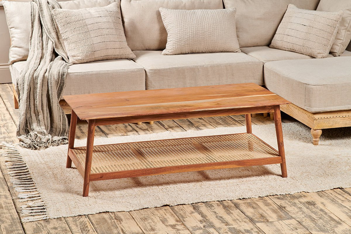 A coffee table should be two-thirds the length of your sofa and sit at the same height or slightly lower than the seat cushions.
