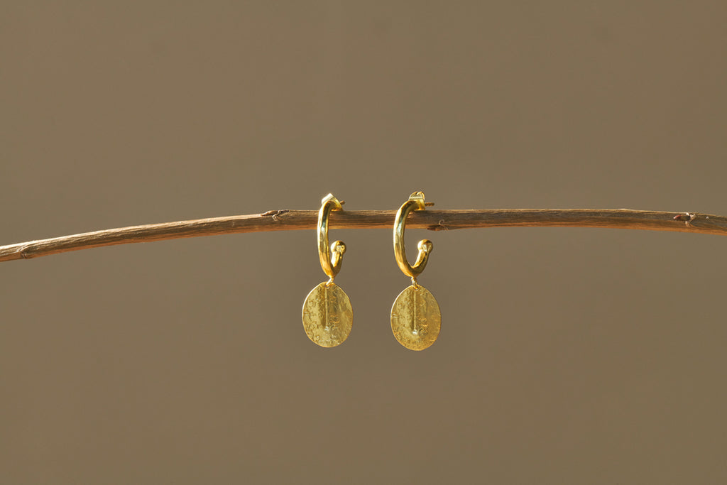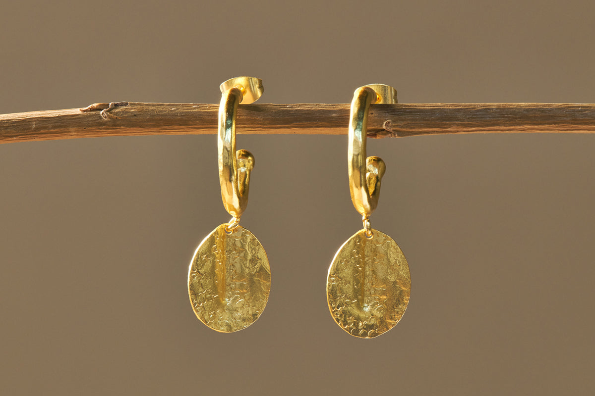 With their warm golden hue and beautiful hoop-and-drop design, our Esta earrings make a sophisticated statement. A delicate disc is suspended from a classic hoop and is embellished with an intricate hammered design. Their timeless appearance is enhanced by the traditional techniques used to craft them. Every element of our jewellery collection is handcrafted, a low impact process which involves a skillset that has been honed over decades. The elegant aesthetic of these earrings makes them suitable for both day and evening wear.