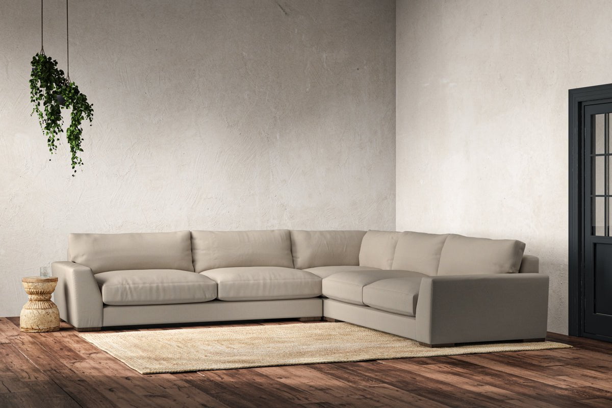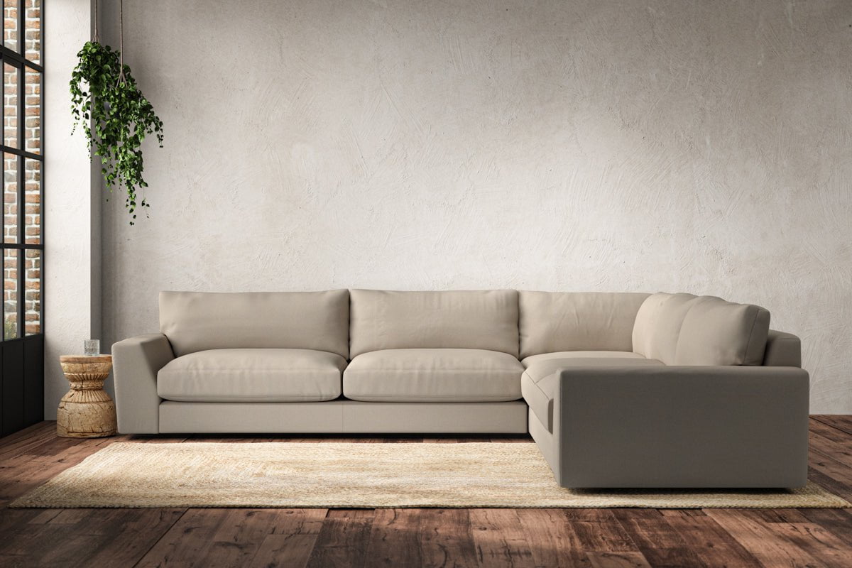 The laid-back sculptural shape of the Guddu grand right hand corner sofa brings effortless style to an interior. The generous arms and deep seat cushions make this collection the perfect choice for families or those that like a bit of extra space to stretch out. Details include separate back cushions, exceptional quality fabrics and solid wood block feet. Each piece is handcrafted by experts using traditional techniques for a quality finish that celebrates the best of British craftmanship.
