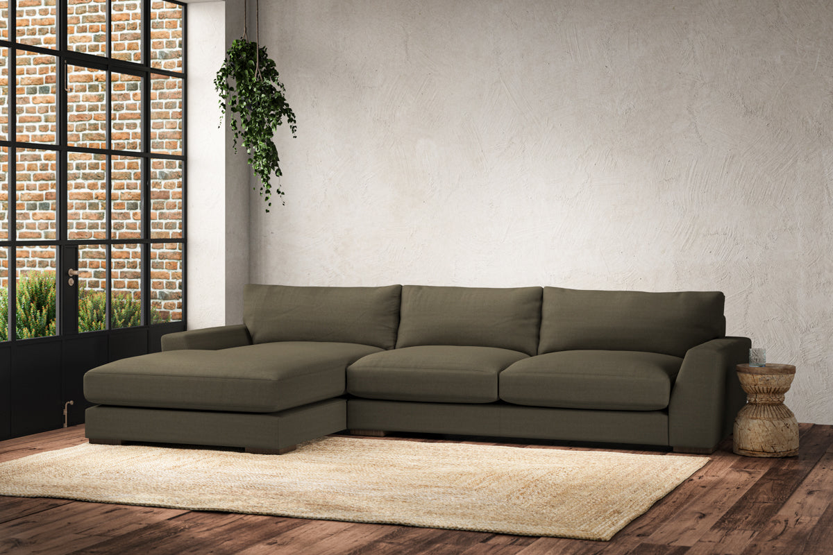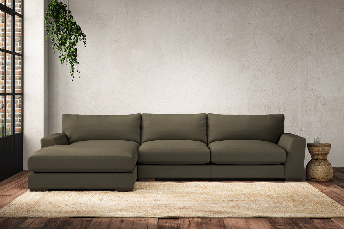 The laid-back sculptural shape of the Guddu large left hand chaise sofa brings effortless style to an interior. The generous arms and deep seat cushions make this collection the perfect choice for families or those that like a bit of extra space to stretch out. Details include separate back cushions, exceptional quality fabrics and solid wood block feet. Each piece is handcrafted by experts using traditional techniques for a quality finish that celebrates the best of British craftmanship.
