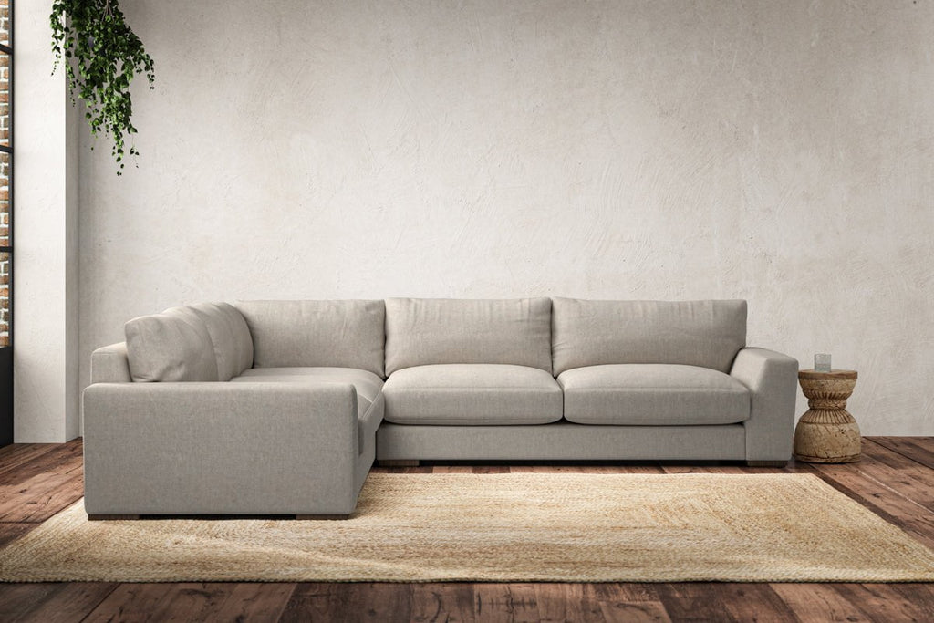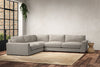 The laid-back sculptural shape of the Guddu large left hand corner sofa brings effortless style to an interior. The generous arms and deep seat cushions make this collection the perfect choice for families or those that like a bit of extra space to stretch out. Details include separate back cushions, exceptional quality fabrics and solid wood block feet. Each piece is handcrafted by experts using traditional techniques for a quality finish that celebrates the best of British craftmanship.