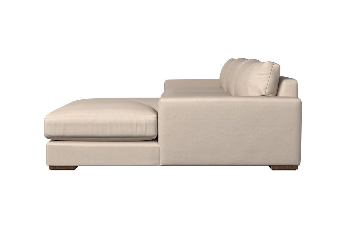 The laid-back sculptural shape of the Guddu large right hand chaise sofa brings effortless style to an interior. The generous arms and deep seat cushions make this collection the perfect choice for families or those that like a bit of extra space to stretch out. Details include separate back cushions, exceptional quality fabrics and solid wood block feet. Each piece is handcrafted by experts using traditional techniques for a quality finish that celebrates the best of British craftmanship.