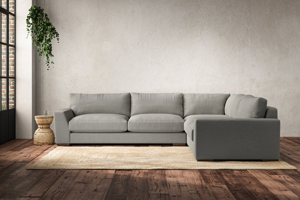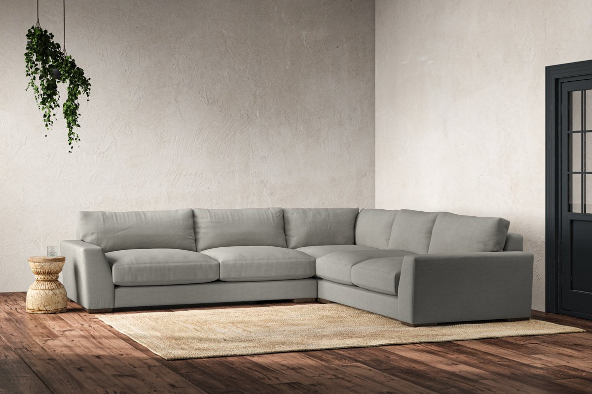 The laid-back sculptural shape of the Guddu large right hand corner sofa brings effortless style to an interior. The generous arms and deep seat cushions make this collection the perfect choice for families or those that like a bit of extra space to stretch out. Details include separate back cushions, exceptional quality fabrics and solid wood block feet. Each piece is handcrafted by experts using traditional techniques for a quality finish that celebrates the best of British craftmanship.