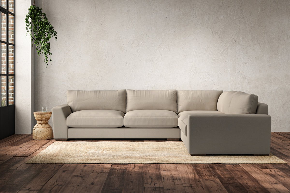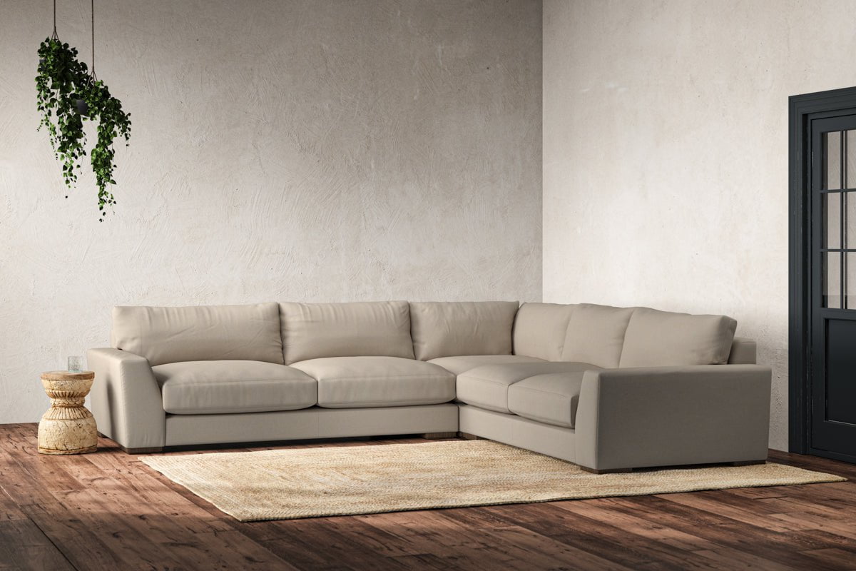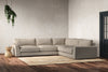 The laid-back sculptural shape of the Guddu large right hand corner sofa brings effortless style to an interior. The generous arms and deep seat cushions make this collection the perfect choice for families or those that like a bit of extra space to stretch out. Details include separate back cushions, exceptional quality fabrics and solid wood block feet. Each piece is handcrafted by experts using traditional techniques for a quality finish that celebrates the best of British craftmanship.