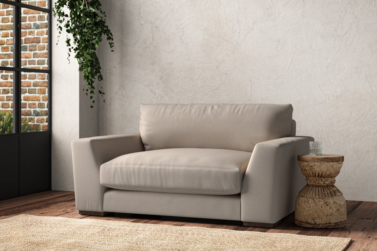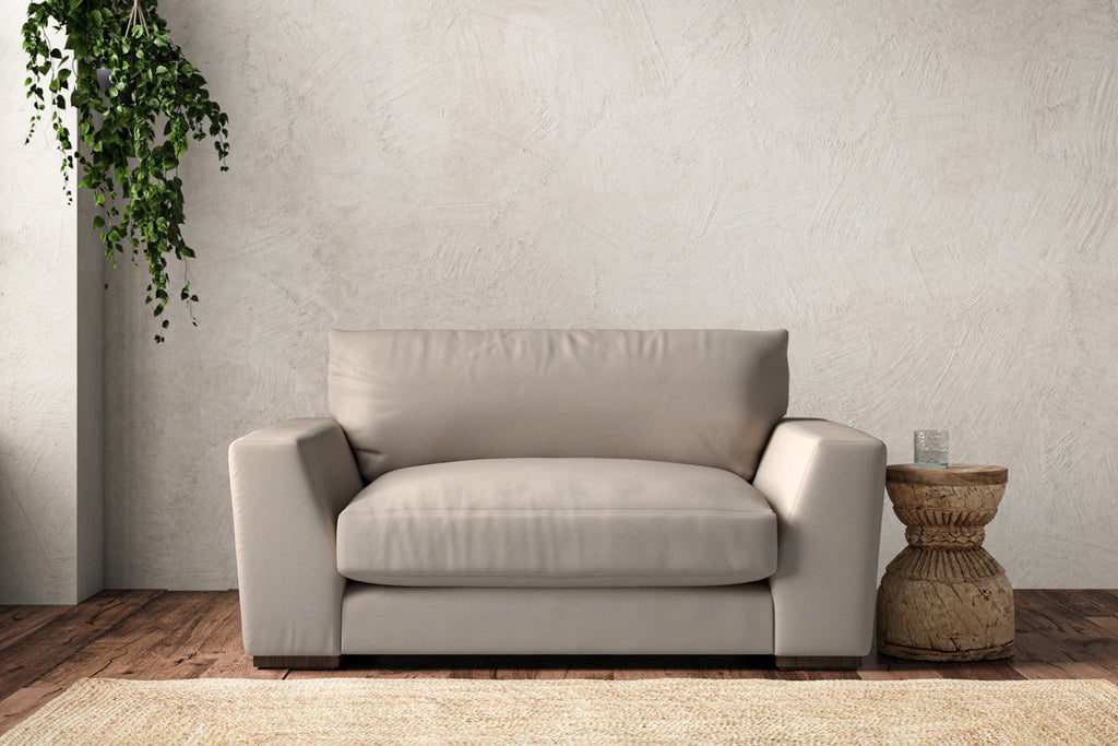The laid-back sculptural shape of the Guddu loveseat brings effortless style to an interior. The generous arms and deep seat cushions make this collection the perfect choice for families or those that like a bit of extra space to stretch out. Details include separate back cushions, exceptional quality fabrics and solid wood block feet. Each piece is handcrafted by experts using traditional techniques for a quality finish that celebrates the best of British craftmanship.