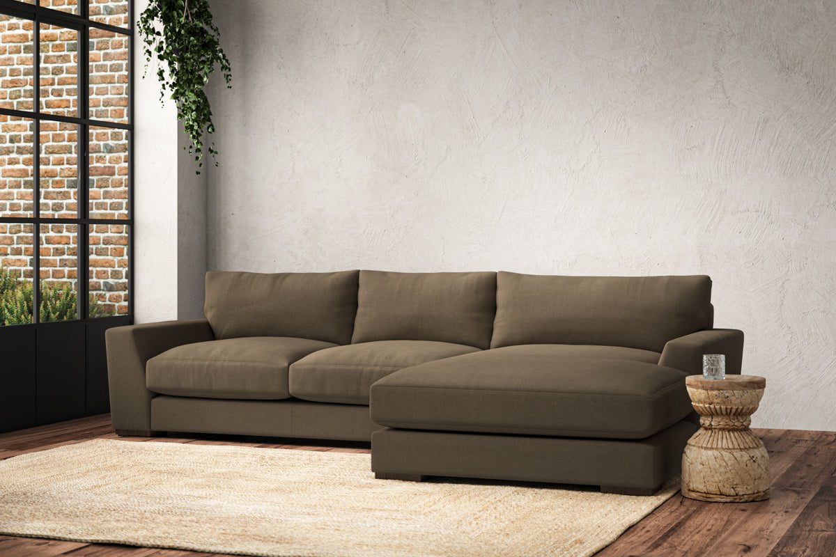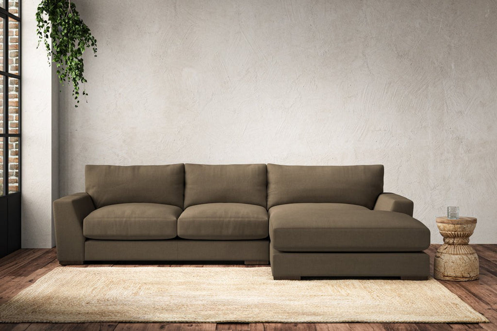 The laid-back sculptural shape of the Guddu medium right hand chaise sofa brings effortless style to an interior. The generous arms and deep seat cushions make this collection the perfect choice for families or those that like a bit of extra space to stretch out. Details include separate back cushions, exceptional quality fabrics and solid wood block feet. Each piece is handcrafted by experts using traditional techniques for a quality finish that celebrates the best of British craftmanship.
