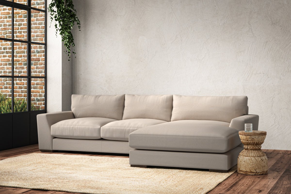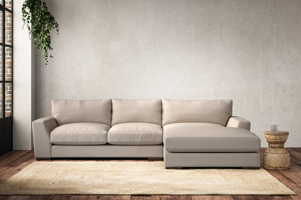 The laid-back sculptural shape of the Guddu medium right hand chaise sofa brings effortless style to an interior. The generous arms and deep seat cushions make this collection the perfect choice for families or those that like a bit of extra space to stretch out. Details include separate back cushions, exceptional quality fabrics and solid wood block feet. Each piece is handcrafted by experts using traditional techniques for a quality finish that celebrates the best of British craftmanship.
