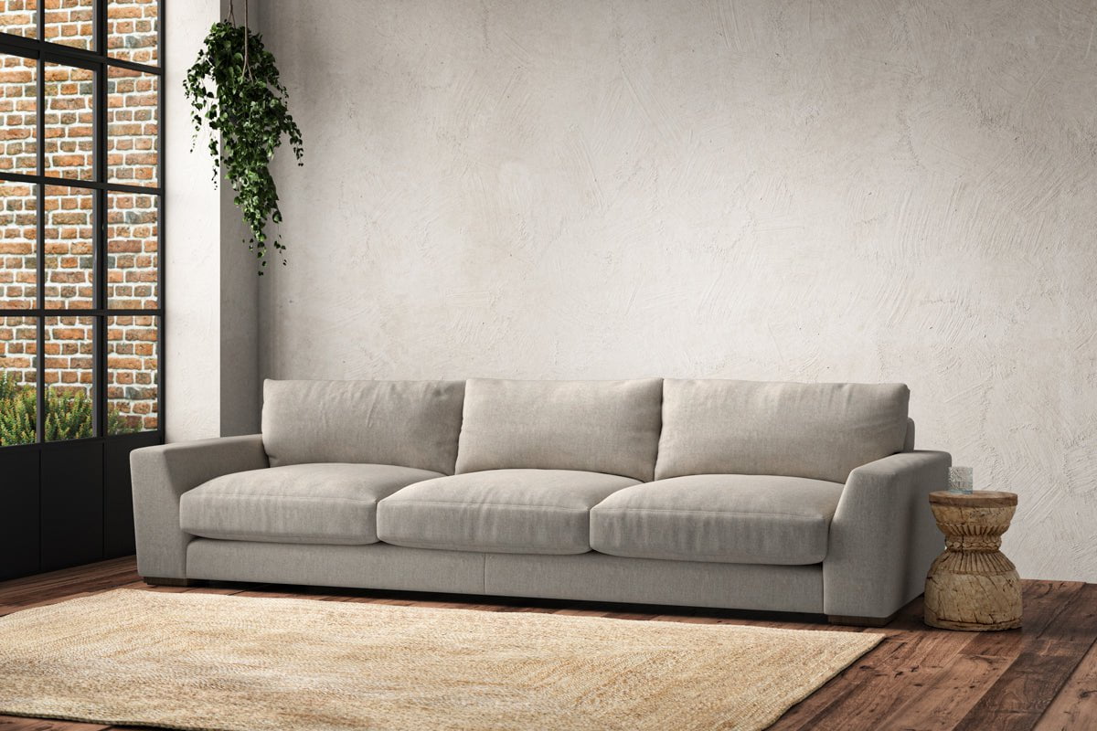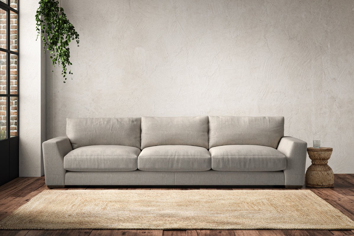 The laid-back sculptural shape of the Guddu super grand sofa brings effortless style to an interior. The generous arms and deep seat cushions make this collection the perfect choice for families or those that like a bit of extra space to stretch out. Details include separate back cushions, exceptional quality fabrics and solid wood block feet. Each piece is handcrafted by experts using traditional techniques for a quality finish that celebrates the best of British craftmanship.