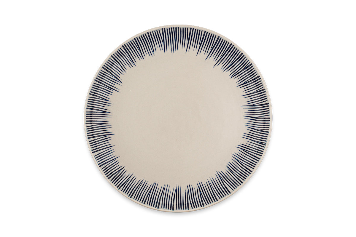 Our Karuma ceramic plates have a distinctive and striking design. The thin blue lines are first etched into the clay and then hand painted. The design frames each piece perfectly and provides a backdrop for serving up meals in style. This set of 12 ceramics includes everything you need for four people - 4 dinner plates, 4 side plates, and 4 bowls. Made in North Vietnam using age-old methods, this collection is painted and shaped by hand by artisans incorporating traditional and contemporary influences.