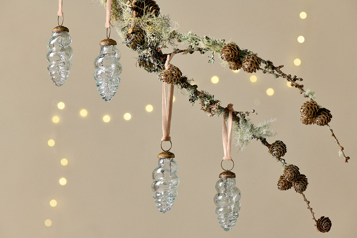 The elegant design used in our set of 4 Khol Shell Bauble is inspired by coastal treasures and moulded from clear recycled glass with a subtle hint of sparkle. The organic design tapers to a gentle point and creates a striking look when hung from a bare branch or among luxuriant foliage for a sumptuous yet simple look that brings natural charm to any scheme: delightfully striking alongside festive foliage, organic objects and natural materials. Finished with an antique-style clasp and elegant velvet ribbon.