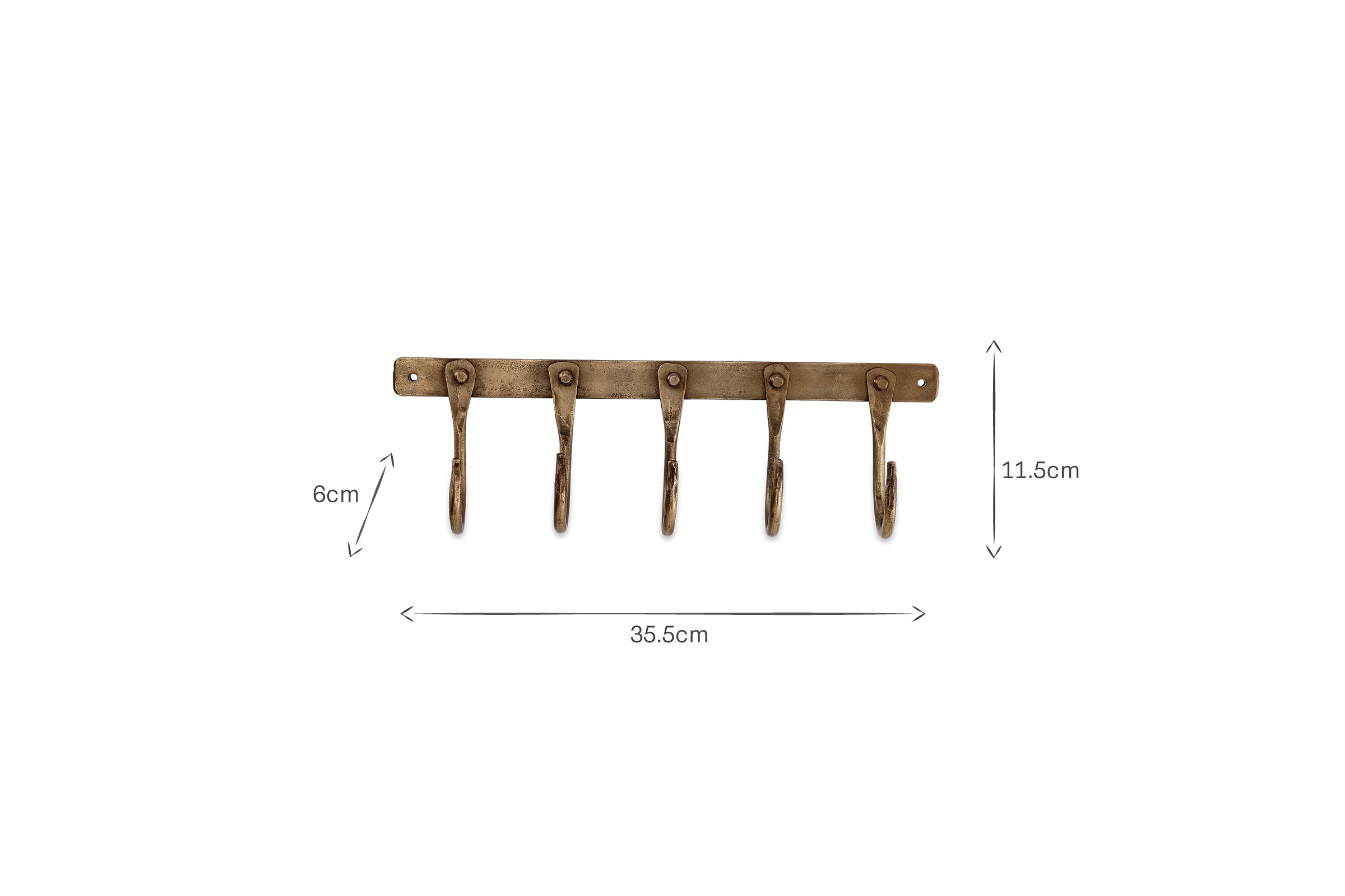 These Kuna iron hooks have an antique brass patina. The elegant display is perfect for small storage items.
