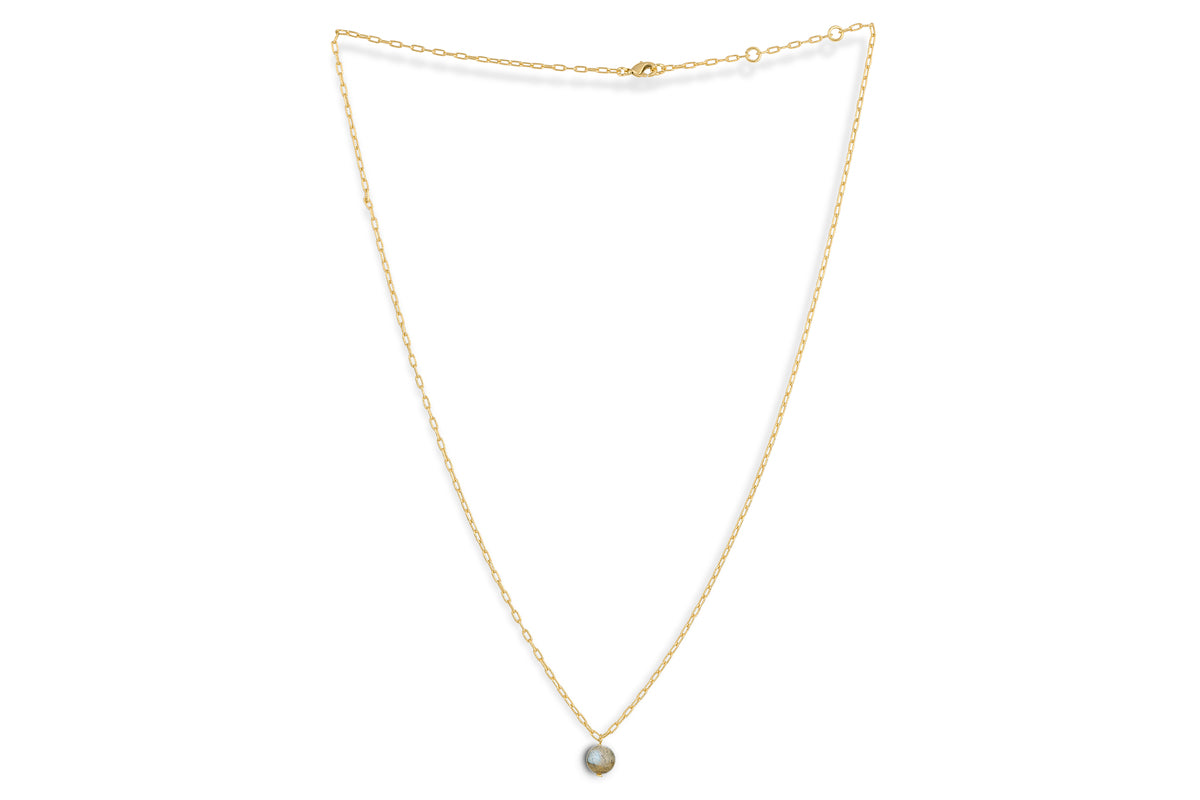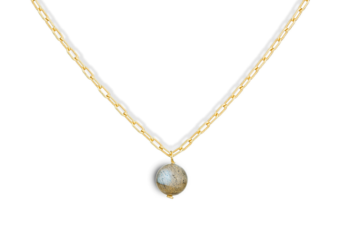 The Marai labradorite necklace brings understated elegance to everyday style. The gold-plated pendant features labradorite with soft grey tones and natural iridescence that shift subtly in the light. Hanging from a fine chain, its simple design draws attention to the calming, distinctive quality of the stone. Presented in a linen pouch, it makes a thoughtful gift or a refined addition to your jewellery collection.