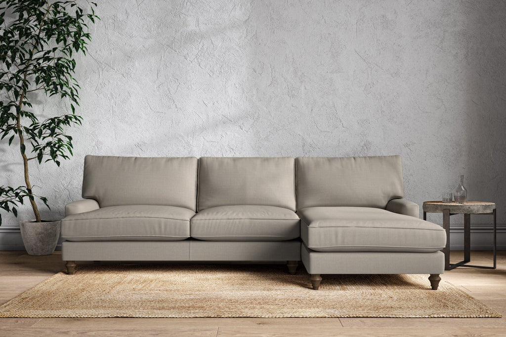 The classic design of our Marri grand right hand chaise sofa has a timeless appeal that suits almost any interior. Each piece is handcrafted by our specialist team in our Nottinghamshire workshop combining traditional techniques with exceptional craftmanship. Well-considered details ensure lasting quality, including piped edging, separate back cushions, and hand-turned hardwood feet.