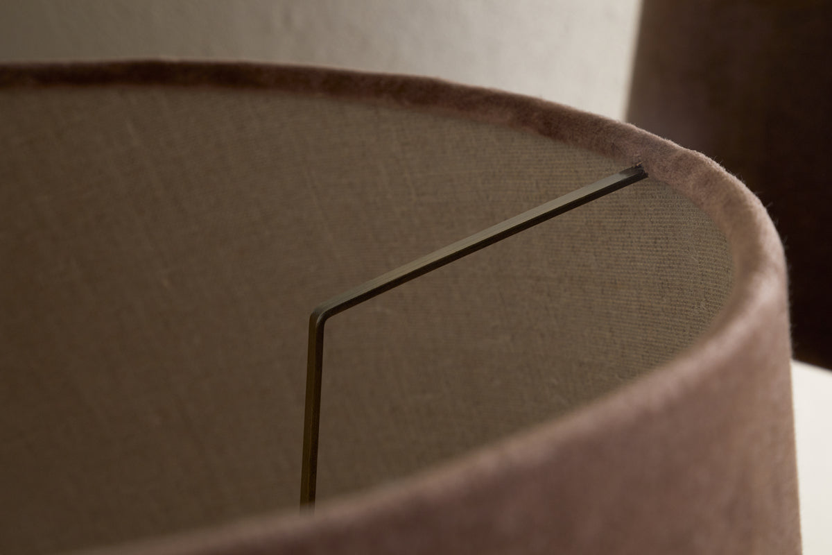 Crafted by hand, this lampshade is stitched using a combination of linen and velvet fabric wrapped around a sturdy metal frame. The careful layering and construction reflect skilled craftsmanship, with each piece made to highlight the natural textures and soft detailing of the materials.
