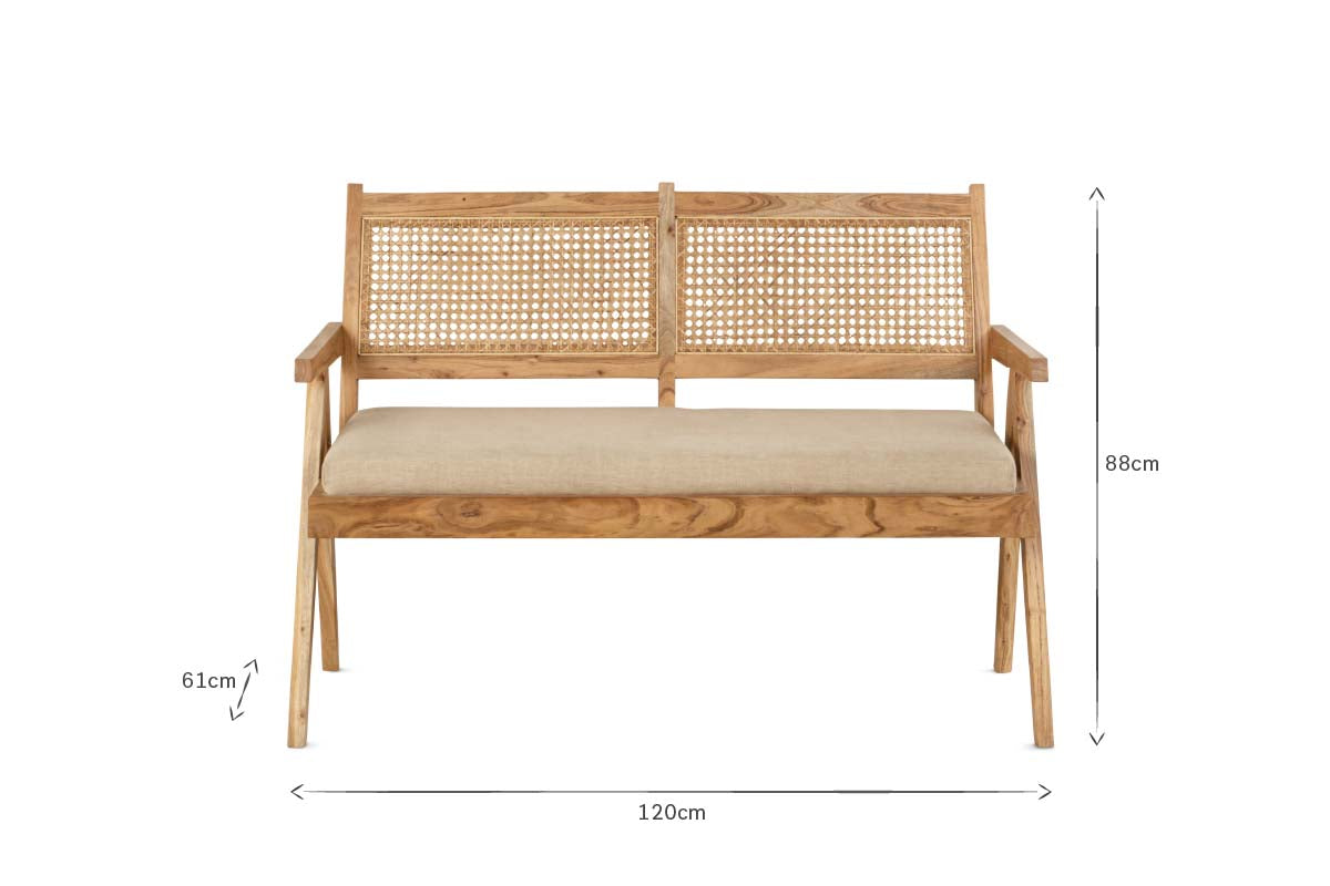 Warm acacia wood is paired with natural cane to create an elegant sofa, which is as sustainable as it is sublime. The robust wooden frame is enhanced by an intricately woven cane backing, adding beautiful detail and character. A soft linen seat pad ensures this sofa is both comfortable and stylish. The neutral colour palette created by these environmentally friendly materials means the sofa suits almost any interior, but it looks particularly stylish in a kitchen or conservatory.