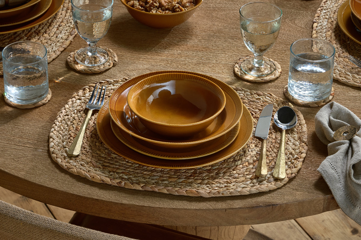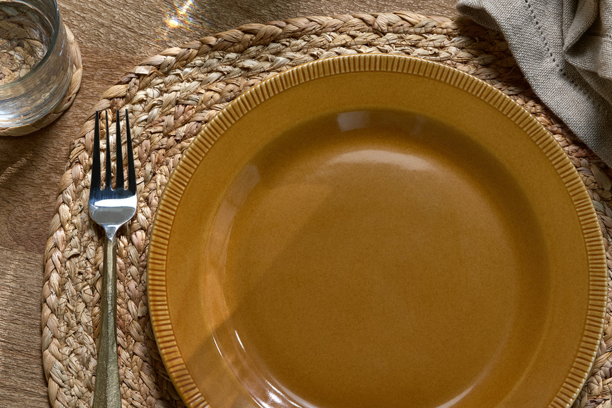 Our new Nuwara dinner plate is a generously proportioned bowl with a simple textured patterning inside that draws the eye. The entire Nuwara tableware collection is beautifully understated in style and design with a distinctive mustard glaze offering a timeless splash of earthy colour at mealtimes. The glaze has a distinctly rich and reflective quality, while the hand-etched line design brings a simple and pared-back aesthetic to the table.