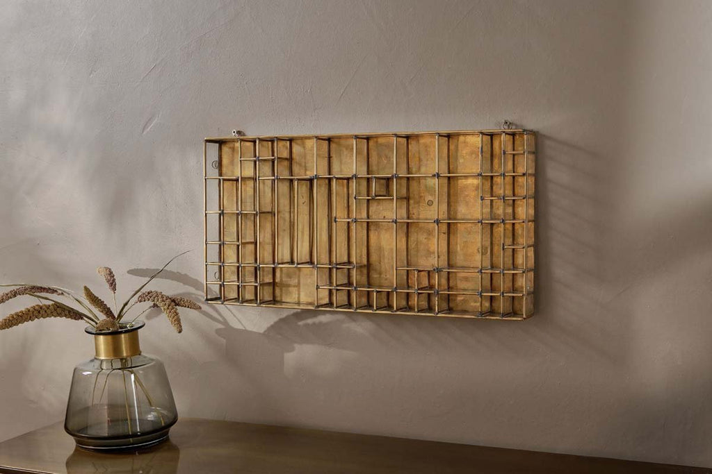 The Oni brass printer drawer takes its inspiration from traditional printing drawers, originally used to hold each individual letter for an old fashioned printing press. This modern take marries the luxurious qualities of brass with exceptional craftmanship, where each square has been carefully soldered using age-old techniques. The reverse of the printer drawer has a rich patina that really makes this a stand-out piece. Dress with keepsakes and treasures to make your own unique piece of wall art.