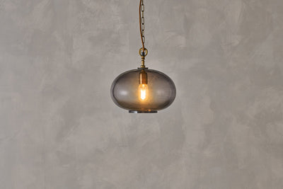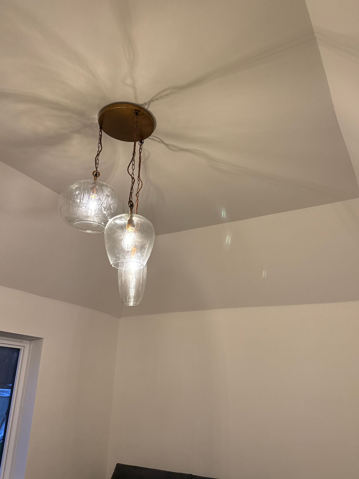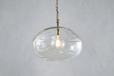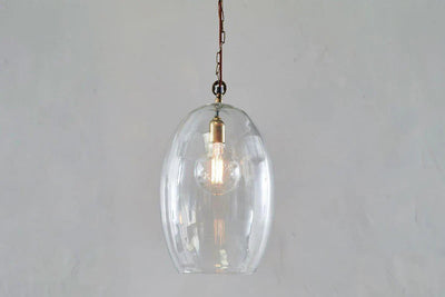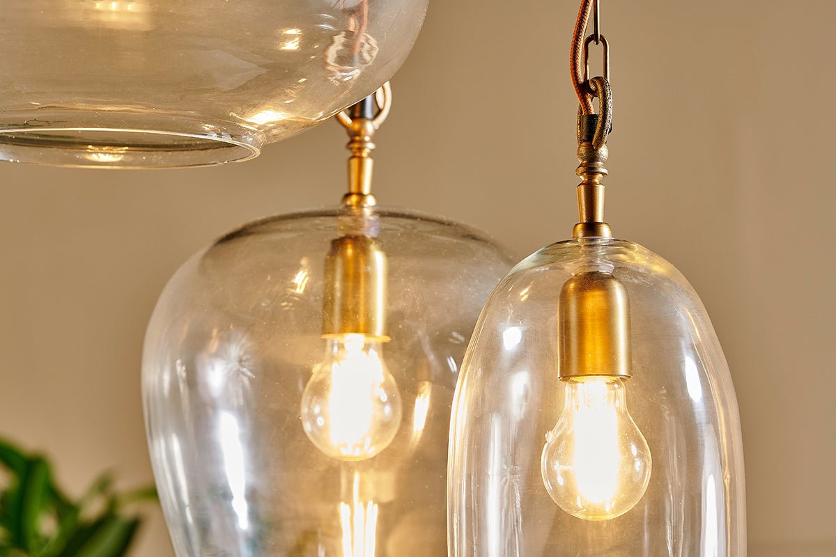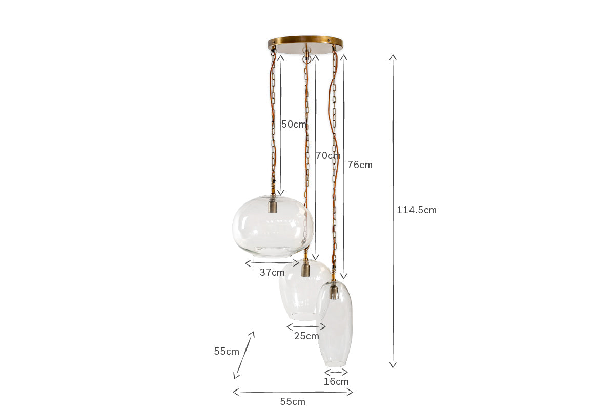 The Otoro statement pendant light is a truly standout piece. The different organic shapes of the Otoro recycled glass shades work beautifully together. The generous proportions of each light combine to create an exceptional pendant feature light that will elevate a space. This is a large statement piece that is well suited to a high ceilinged room or stair well. The Otoro glass lights are made from recycled glass. The simple black coloured fabric cable sits neatly in a brass ceiling rose. Each light is supported with a simple brass chain