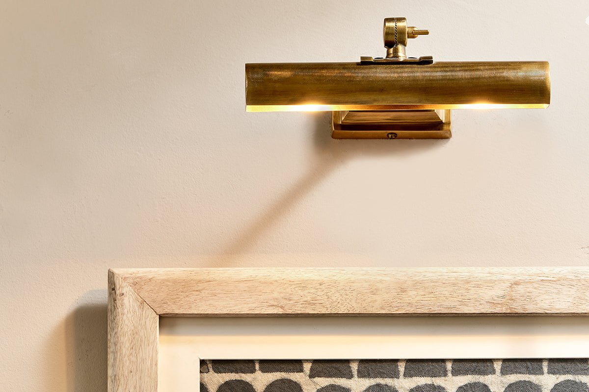 The Pania picture light blends a traditional picture light design with the warm tone of antique brass. Picture lights are a simple way to keep your favourite pieces of art well-lit and visible. They're intended to spread light evenly across the whole artwork. They also provide a soft layer of light, that can help soften a mood in a room and create a more cosy environment. The basic principle for a traditional picture light is that your picture light should be half to a third of your artwork, excluding its frame. This applies mostly to landscape format paintings. For artwork in portrait format, the picture light should be approximately half of the width of the painting, exclusive of the frame.