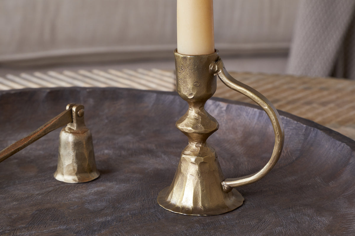 The Prema candle holder features a rustic hammered finish that brings an organic, timeworn character to your table. Its distinctive oversized handle adds a touch of vintage charm, making it both decorative and functional. Perfect on its own or paired with our brass candle snuffer for a beautifully considered display.
